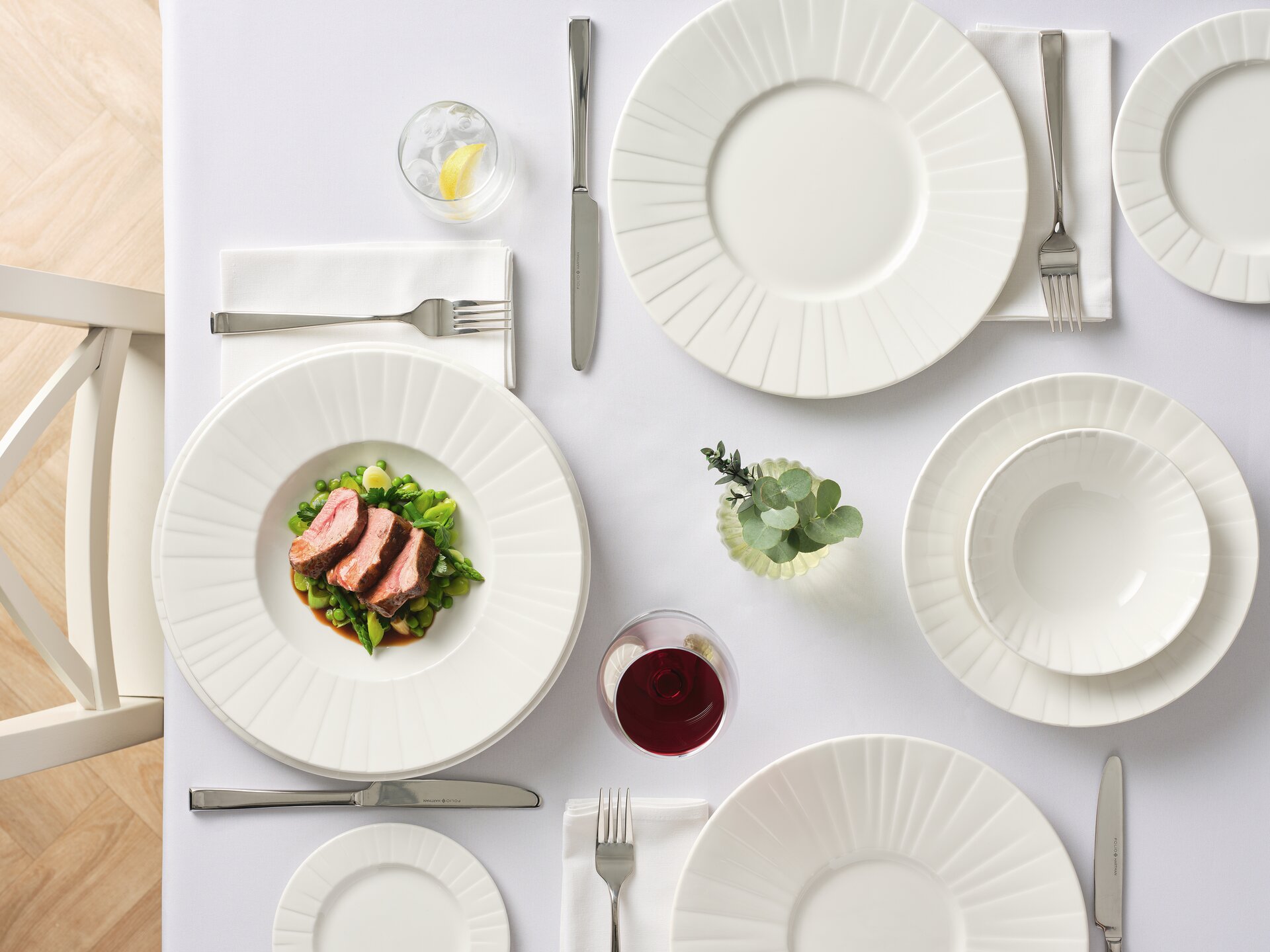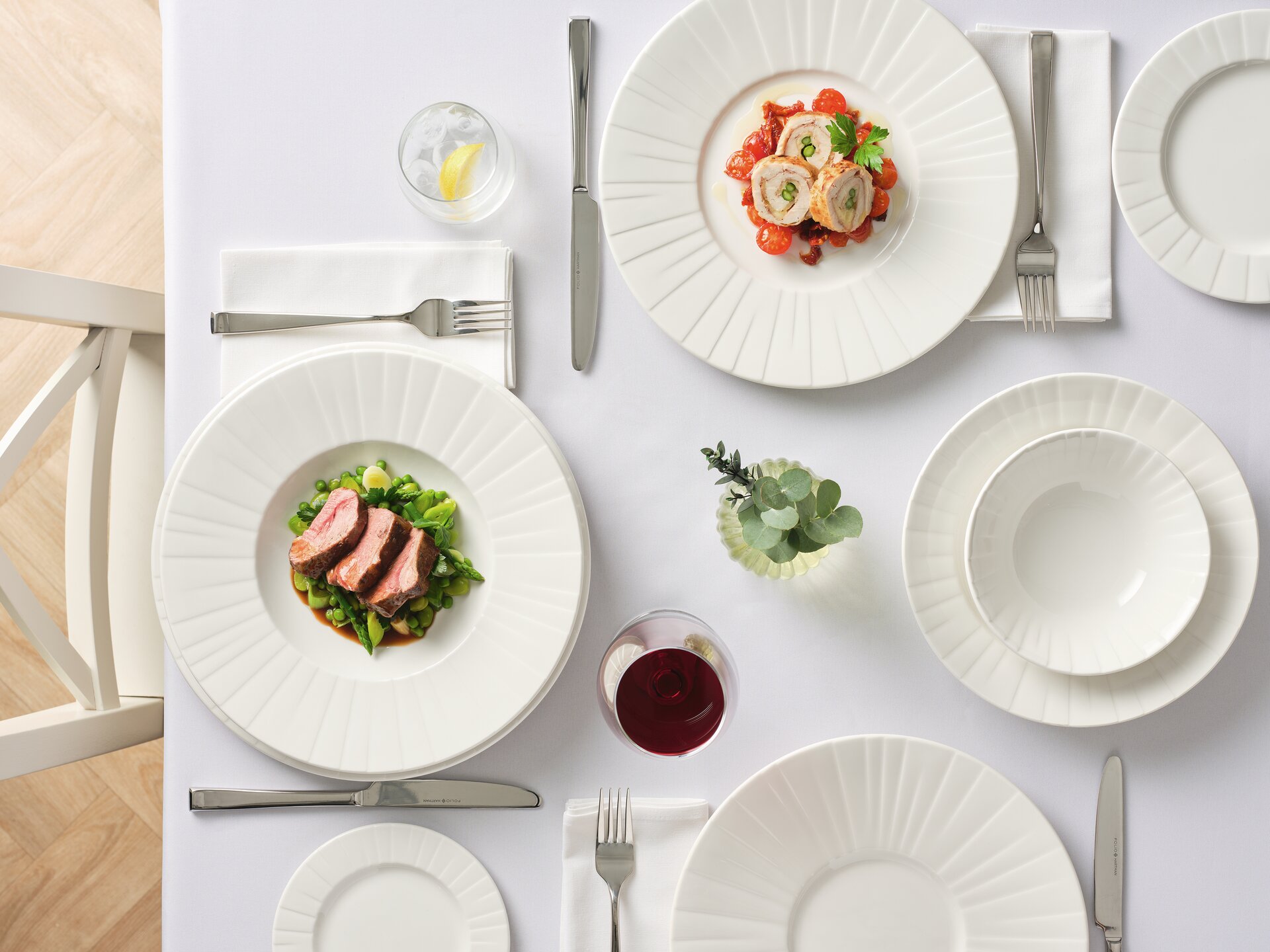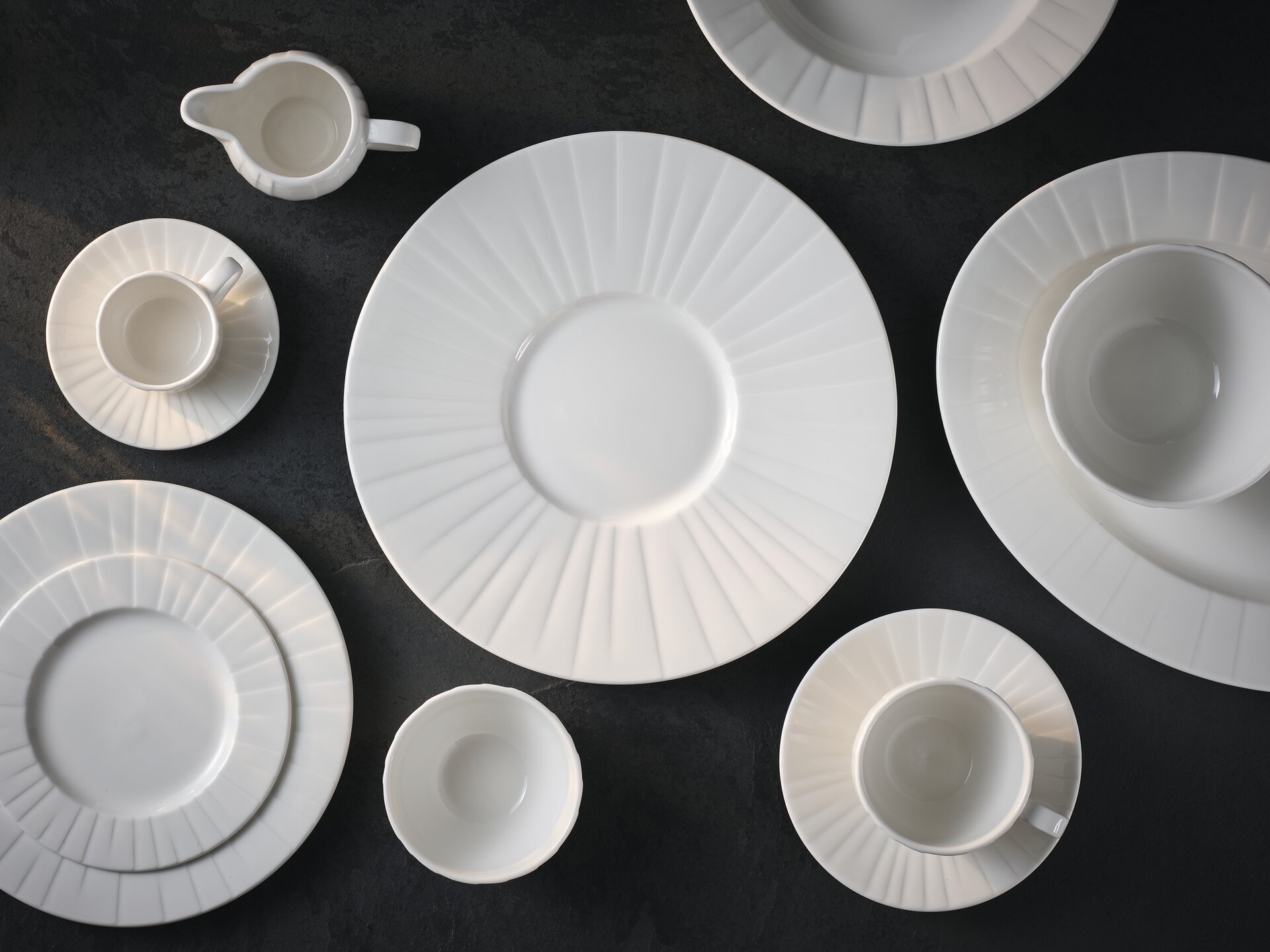 Alina vereint zwei starke und komplementäre Ästhetiken. Die Einfachheit, Linearität und Zurückhaltung des japanischen Designs gepaart mit einem lockeren, zugänglichen und lässigen Stil, der die skandinavische Lebensart verkörpert. Die Alina-Prägung lenkt den Blick auf die Mitte des Stücks und verleiht der Kreativität des Küchenchefs Ernsthaftigkeit und Fokus. Alina bietet ein Zusammenspiel von Licht und Linien, das eine entspannte und moderne Plattform für heutige Bankette und gehobene Gastronomie bietet.