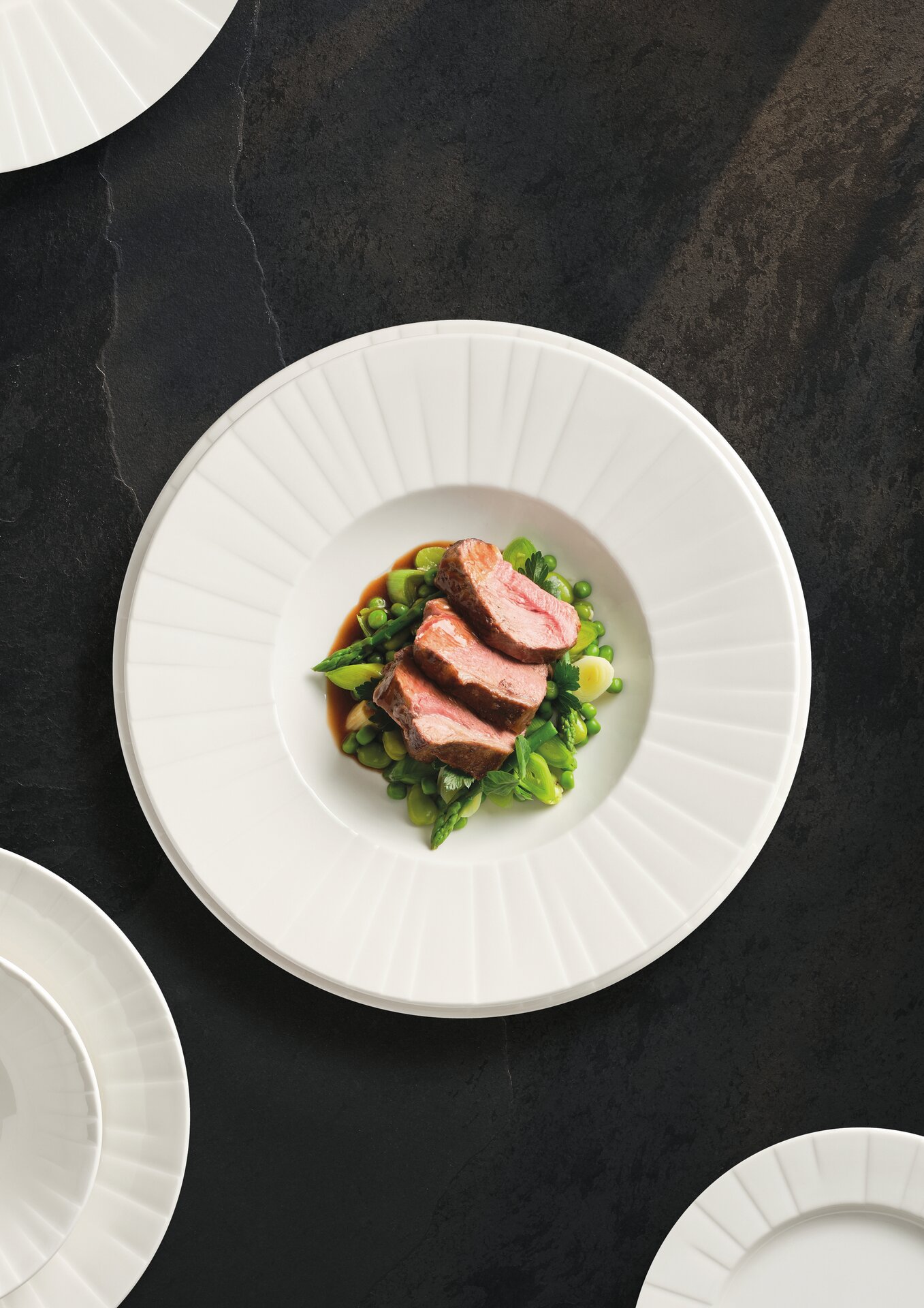 Alina vereint zwei starke und komplementäre Ästhetiken. Die Einfachheit, Linearität und Zurückhaltung des japanischen Designs gepaart mit einem lockeren, zugänglichen und lässigen Stil, der die skandinavische Lebensart verkörpert. Die Alina-Prägung lenkt den Blick auf die Mitte des Stücks und verleiht der Kreativität des Küchenchefs Ernsthaftigkeit und Fokus. Alina bietet ein Zusammenspiel von Licht und Linien, das eine entspannte und moderne Plattform für heutige Bankette und gehobene Gastronomie bietet.