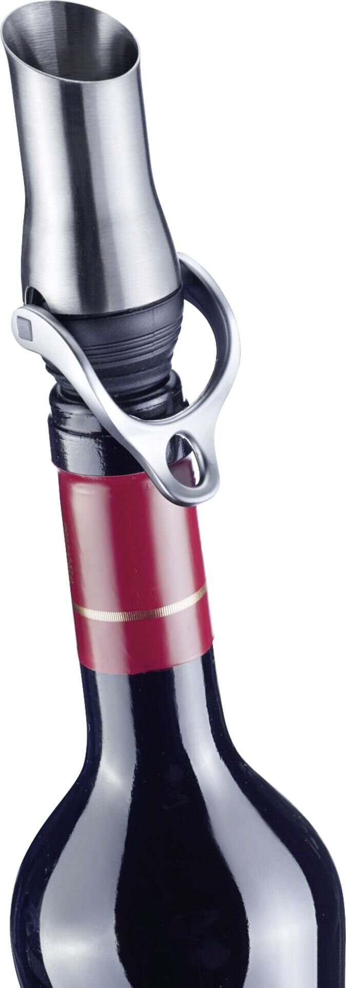 Edelstahl, Silikon, für tropfenfreies Ausgießen, der Lamellenkorken passt sich optimal an den Flaschenhals an, durch Herunterklappen des Hebels wird der innenliegende Verschließmechanismus betätigt, nicht spülmaschinengeeignet. Nicht für Sekt oder Champagner geeignet.