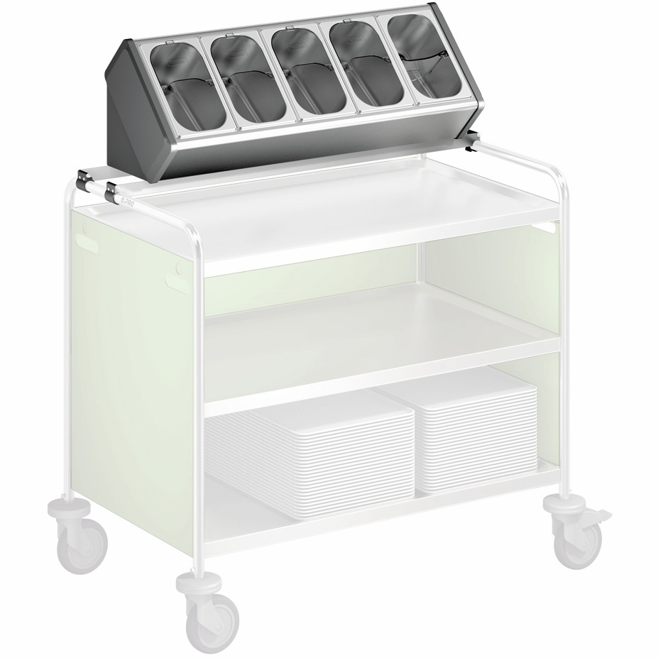 In Kombination mit SW 10 x 6 bietet der neue Besteckaufsatz genug Platz für Besteck, Tabletts, Geschirr, Servietten und Würzmittel. Er kann jederzeit nachgerüstet und einfach wieder abgenommen werden. Eine feste Verschraubung sorgt für hohe Stabilität.
