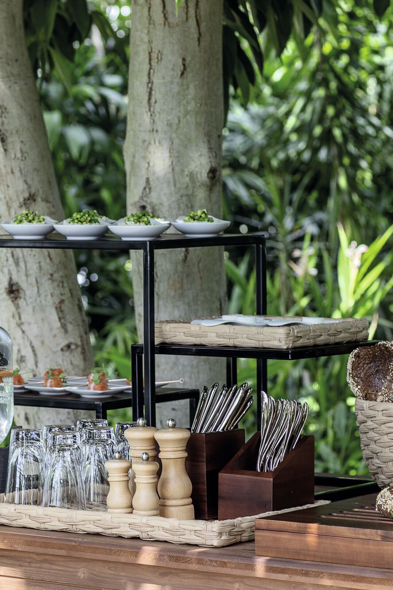 Akazienholz, braun. Abgeschrägt: Höhe vorne 8 cm, hinten 14 cm. Nicht spülmaschinengeeignet.