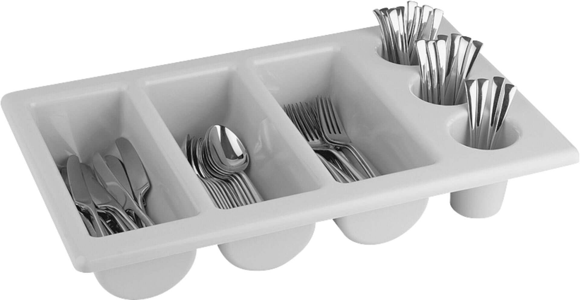 Kunststoff PE, grau. Mit 6 Segmenten (3 Mulden und 3 Köcher Ø 7 cm). Stapelbar, spülmaschinengeeignet.
