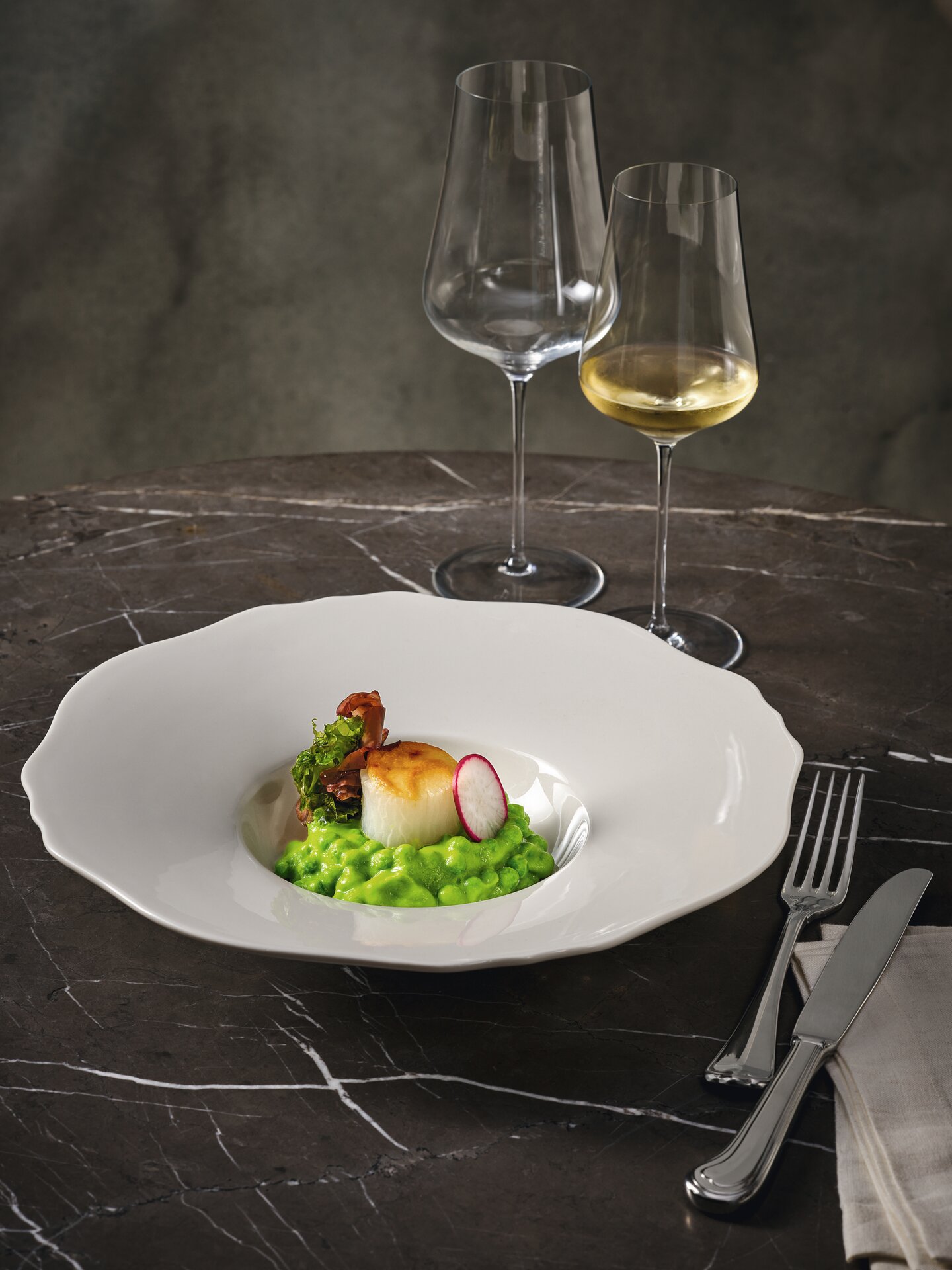 Traditionelle Handarbeit, die mit modernster Maschinenpräzision verschmilzt. Während das weiche und besonders feine Handgefühl des hauchdünnen Stiels von Menschenhand geschaffen wurde, stammt die eindrucksvolle Stabilität und die elegante Kuppa in dieser Serie von Maschinen. Eins geworden für Bordeaux und Burgunder, leichte und kräftige Weißweine sowie für Champagner.