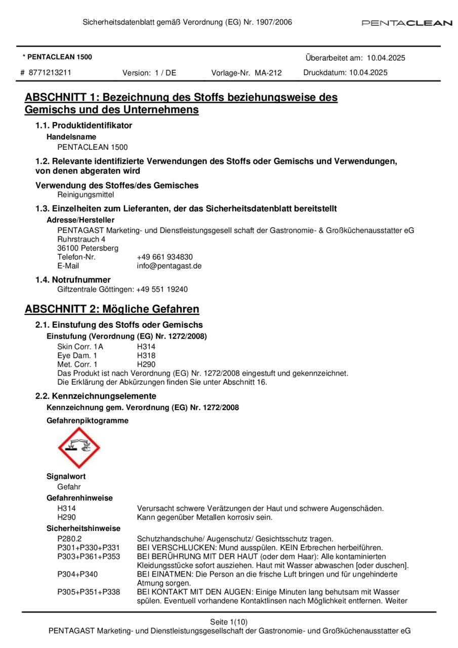 PENTACLEAN 1500 ist ein flüssiges, nicht schäumendes Reinigungskonzentrat für die gewerbliche Anwendung in Großküchen und sonstigen lebensmittelverarbeitenden Betrieben. Auch bei sehr hoher Wasserhärte werden hervorragende Reinigungsergebnisse erzielt. Spülgut aus Porzellan, Kunststoff, Edelstahl und Glas wird bei korrekter Dosierung rückstandsfrei und schonend gereinigt. Durch den hohen Gehalt an wasserhärtebindenden Substanzen ist PENTACLEAN 1500 auch in Maschinen, die ohne Enthärtungsanlagen arbeiten, sehr gut einsetzbar und die Verkalkung der Geräte und Heizstäbe wird wirksam verhindert. PENTACLEAN 1500 ist auch aluminiumgeeignet! Auf Grund des Verzichts aktivchlorhaltiger Verbindungen im Produkt wird durch PENTACLEAN 1500 kein Beitrag zur AOX-Bildung im Abwasser geleistet. PENTACLEAN 1500 wird in gewerblichen Geschirrspülmaschinen von Großküchen und zur Kisten-, Behälter- sowie Teilereinigung in Durchlaufanlagen lebensmittelverarbeitender Betriebe eingesetzt.