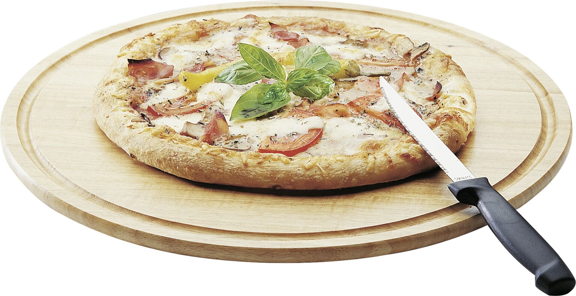 Hartholz, mit Saftrille, nicht spülmaschinengeeignet. Ideal als Servierbrett, Pizzateller oder Brotzeitteller.