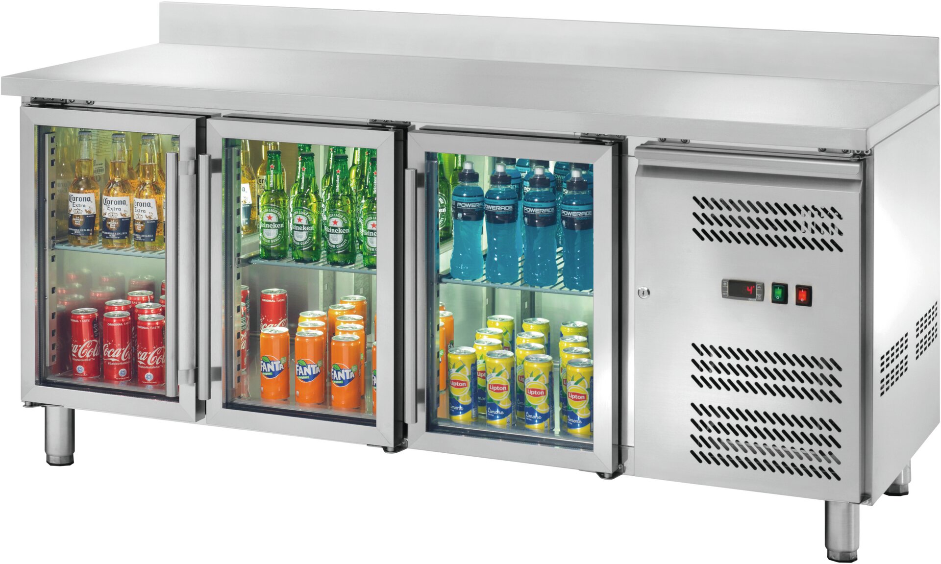 Kühltisch 417 l GN 1/1 mit 100 mm Aufkantung, 3 Glastüren