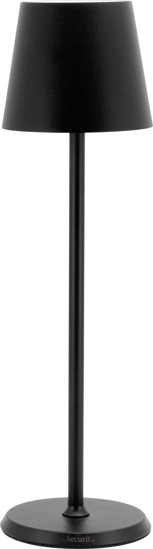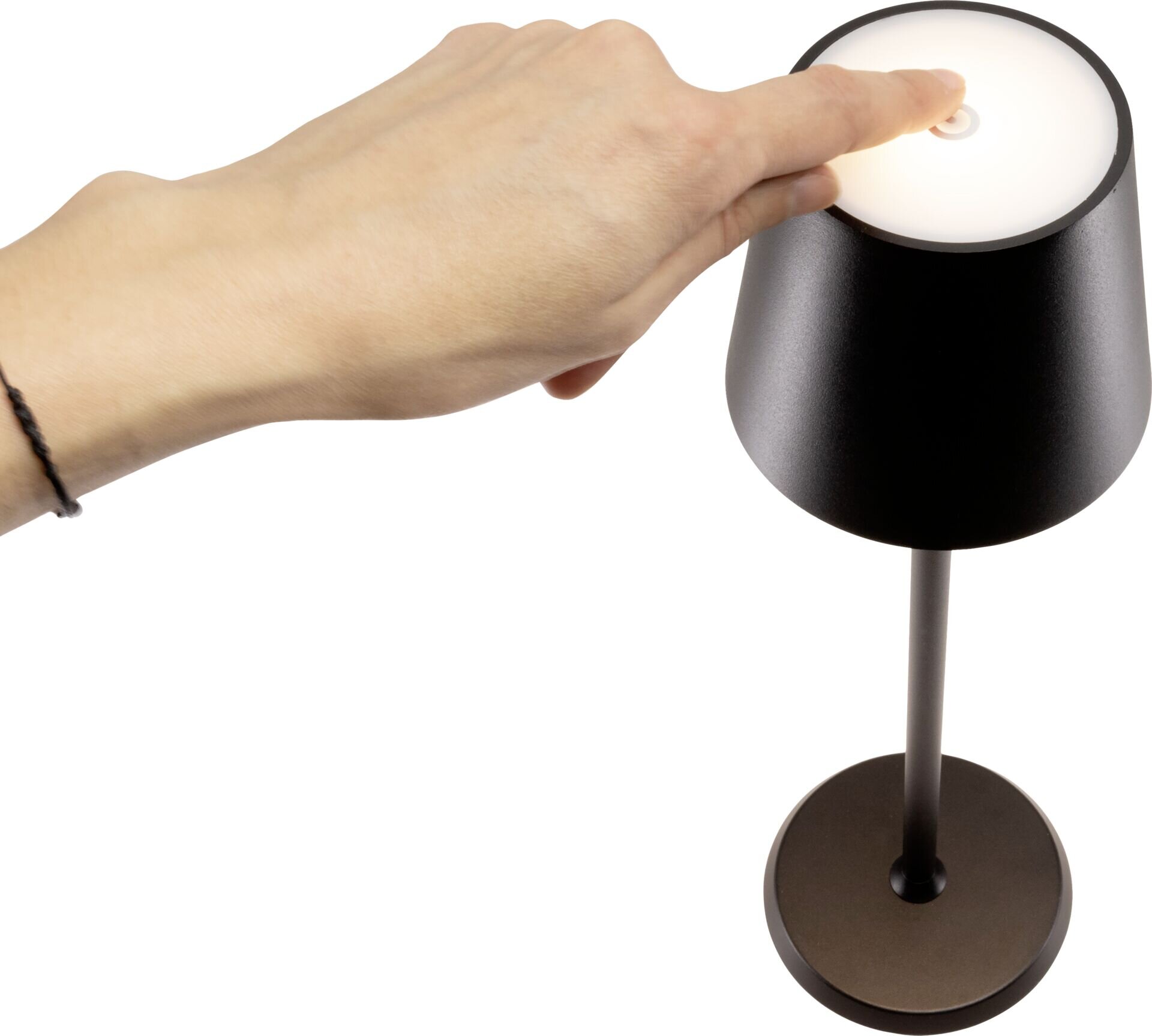 Tischleuchte mit integr. LED und Akku. Stufenlos dimmbar. Wasserdicht nach IP54. Inkl. magnetischem USB Schnellladekabel. Lichttemperatur: 2800K. LxBxH in cm: 11x11x38 Leuchtdauer: bis zu 20 Std Farbe: schwarz