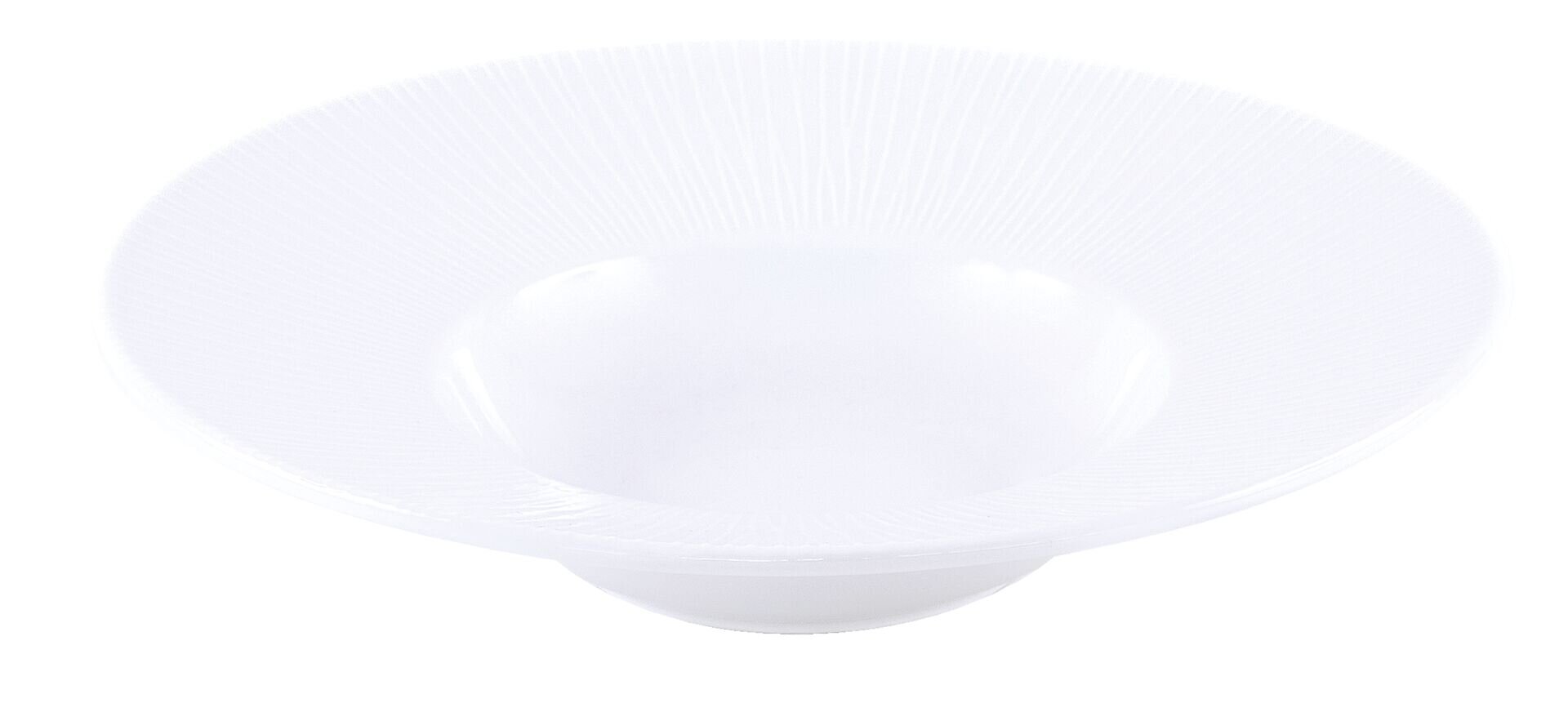 Teller aus weißem Porzellan mit breiter Fahne (6cm) im Rillen-Design. Mischsortierung. Spülmaschinengeeignet.