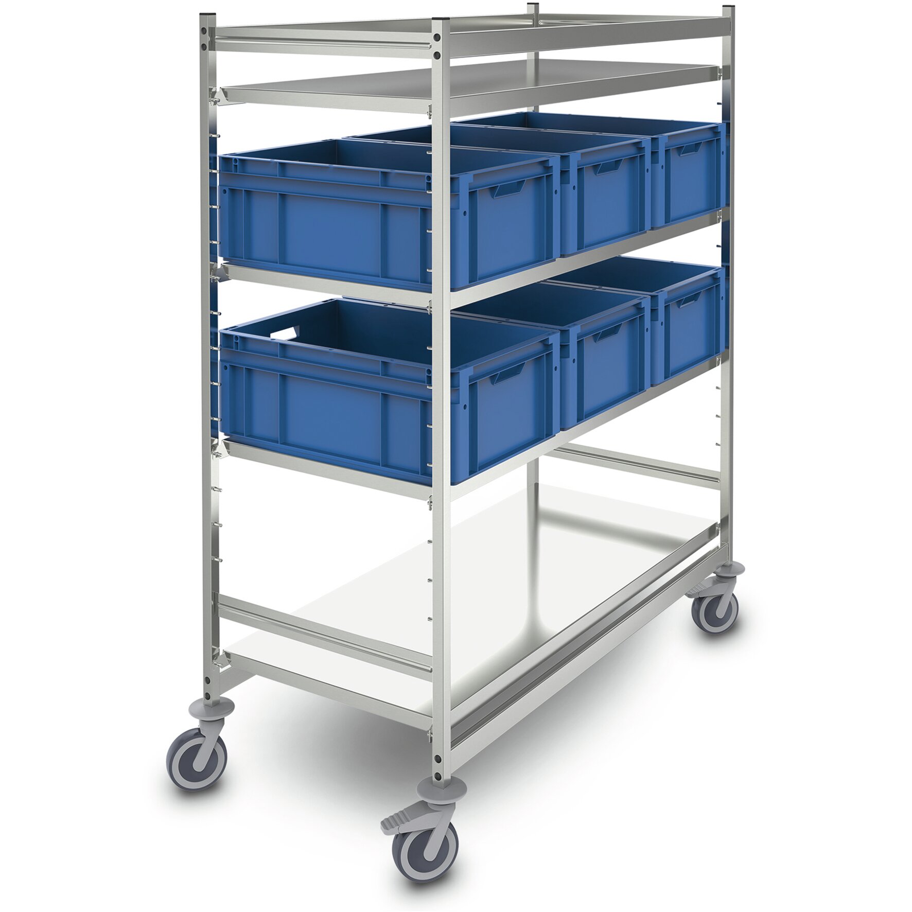 Regaltransportwagen aus hochwertigem Edelstahl in hygienischer Bauweise gemäß DIN 18868-2 für Transport und Zwischenlagerung angelieferter Waren in Eurobehältern.