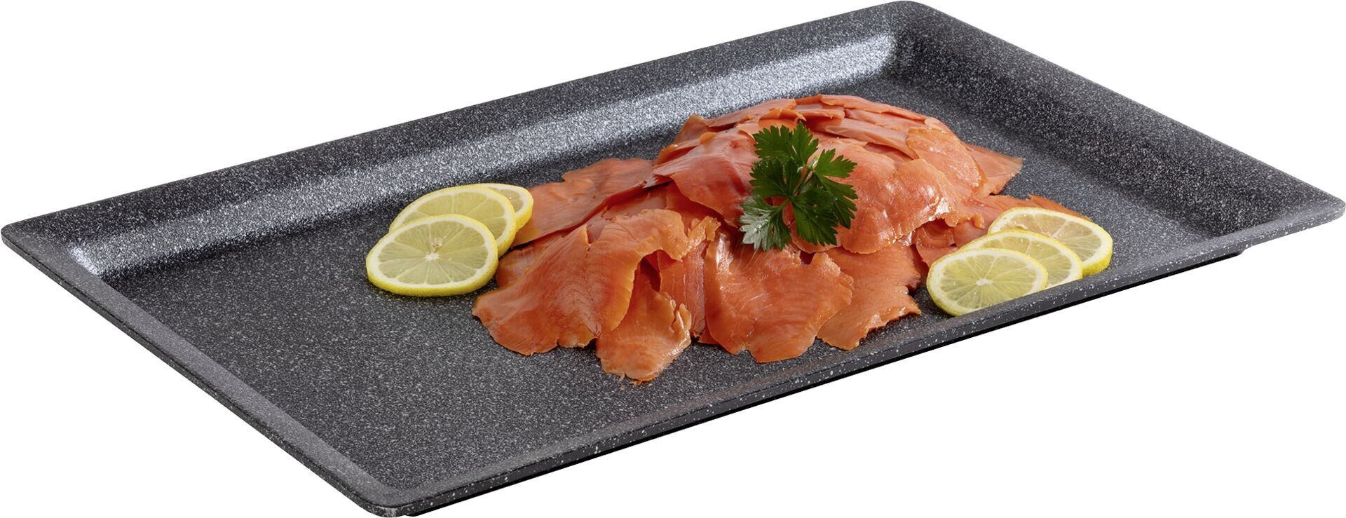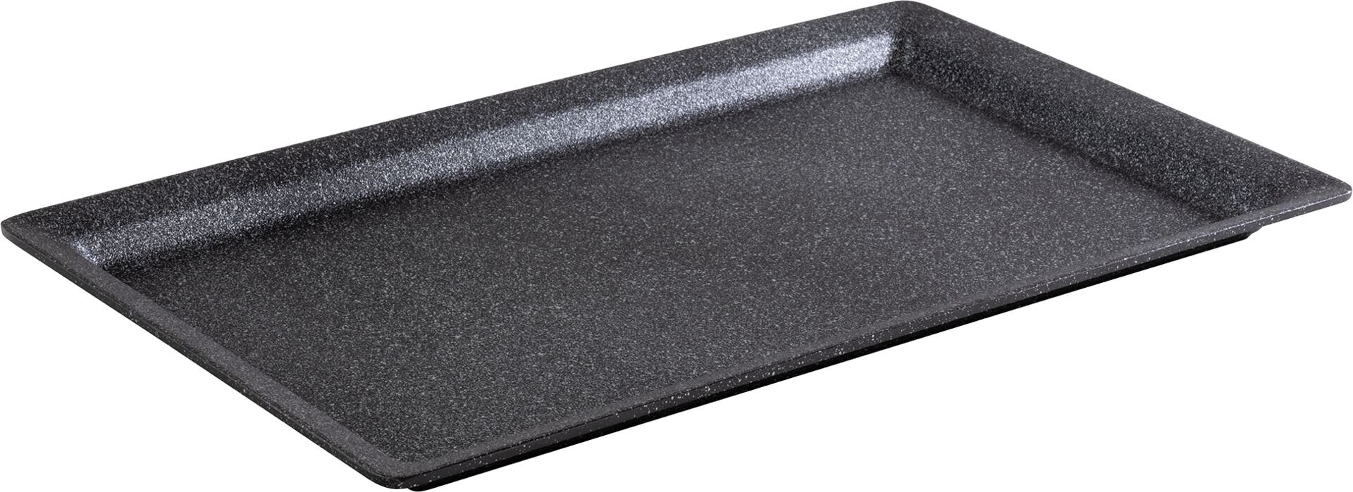 Aluminiumguss, schwarz-silber, antihaftbeschichtet, spülmaschinengeeignet. Temperaturbereich ca. -30 °C bis ca. +200 °C. GN: 1/1 LxBxH in cm: 53x32,5x3