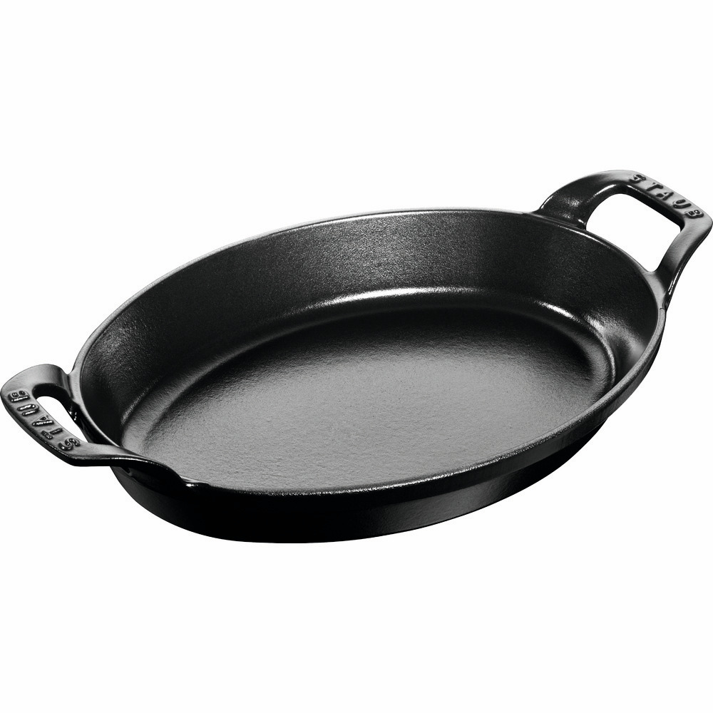 Profiköche wie Paul Bocuse schwören auf Kochgeschirr aus Gusseisen des französischen Herstellers Staub. Gusseisen besitzt hervorragende Wärmeleitungseigenschaften, denn es lässt sich stark erhitzen und gibt die Wärme konstant und gleichmäßig in den Innenraum ab. So werden in dieser Auflaufform von Staub zubereitete Speisen besonders saftig und aromatisch. Die gusseiserne Auflaufform in elegantem Schwarz eignet sich hervorragend zur Zubereitung von Aufläufen und Gratins, aber auch zum Anbraten auf allen Herdarten. Für Schmorgerichte oder köstliche Braten ist die ovale Auflaufform ebenfalls ideal. Die matt-schwarz emaillierte Innenseite verstärkt den Schmoreffekt, sodass der natürliche Eigengeschmack der Speisen optimal zur Geltung kommt. Die Auflaufform ist groß genug für die Zubereitung eines Hauptgerichts für zwei Personen oder einer Beilage für vier Personen. Die an beiden Seiten angebrachten Griffe erleichtern die Handhabung. Präsentieren Sie Ihren Lieben saftige Schmorgerichte, knusprige Gratins und delikate Aufläufe in der formschönen und praktischen Auflaufform von Staub.