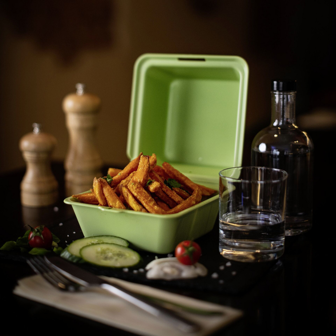 Polypropylen, grün. Mit Öffnungsschlitzen am Deckel zur Dampfentweichung, nicht dichtschließend. Nachhaltige Alternative zu Einwegverpackungen. Für warme und kalte Speisen. Wiederverwendbar, zu 100% recycelbar und natürlich BPA-frei. Für die Mikrowelle, die (Industrie-) Spülmaschine und den Kühlschrank geeignet. Temperaturbereich 0-100°C. CO2 neutral. Made in Germany.