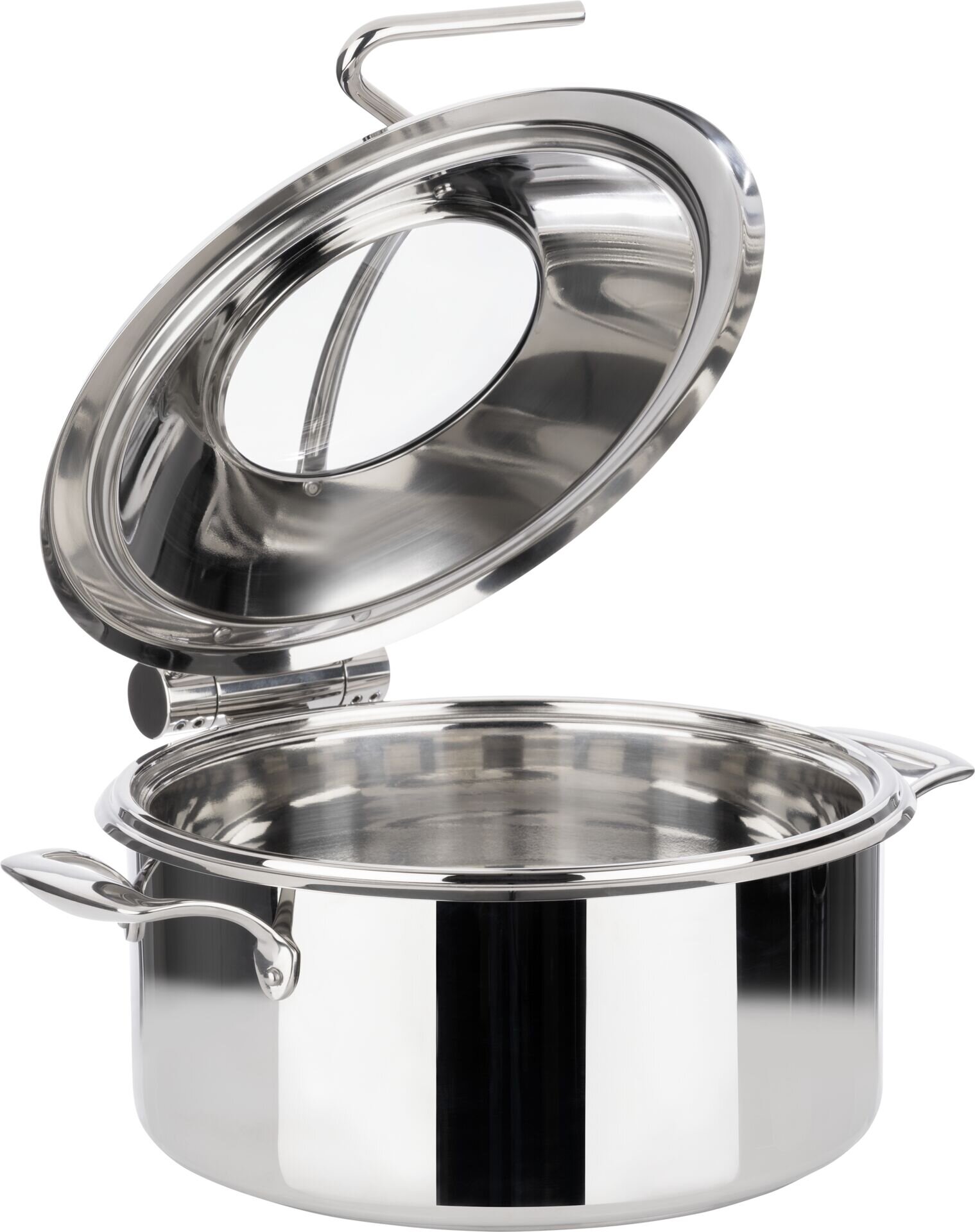 ØxH in cm: 30,5x17,5 4 teiliges Chafing Dish Set, bestehend aus: 1 Topf (8 Liter), 1 Speisebehälter (4 Liter), 1 Deckel mit Sichtfenster und Deckelbremse. Passend zu Artikel 15372, aber auch einzeln einsetzbar. Induktionsgeeignet!