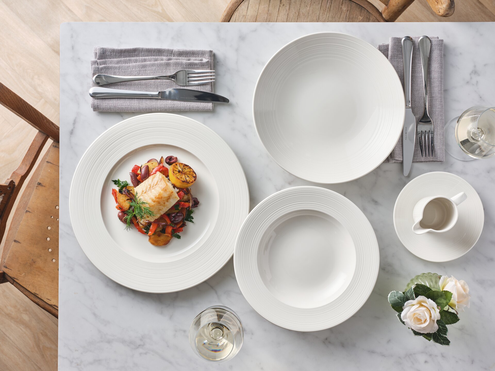 Die Concorde-Reihe ist von der anspruchsvollen Ästhetik des klassischen Mid-Century-Stils durchdrungen. Klare Linien und eine frische, dezente haptische Oberfläche harmonieren mit einem warmen, ansprechenden, cremefarbenen Ton, um einen lässigen und dennoch klaren Präsentationsstil für Speisen zu schaffen. Alle Artikel wurden sorgfältig entworfen, um in einer geschäftigen Küche diskret zu funktionieren und gleichzeitig eine hervorragende Haltbarkeit zu bieten. Ein Schlüsselmerkmal ist die Stapelbarkeit, die eine effiziente Lagerung von Gegenständen ermöglicht, ebenso wie die Kompatibilität, die es ermöglicht, verschiedene Gegenstände übereinander zu stapeln und eine gemeinsame Untertasse zu verwenden. Durch die Verwendung von Coupé- und Randprofilen bietet die Concorde-Reihe eine moderne und dennoch funktionale Ästhetik, um die allerbeste Küche zu präsentieren.