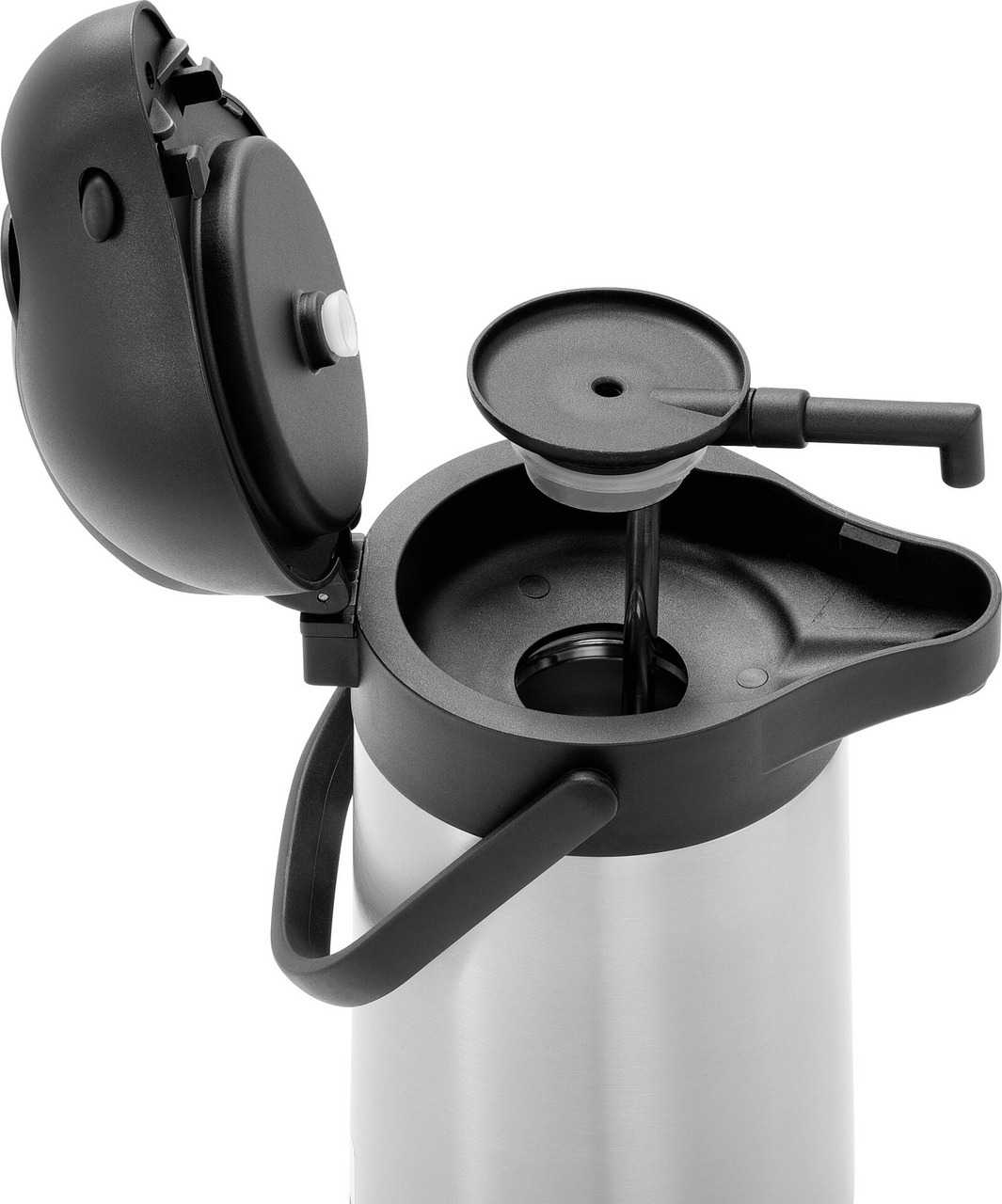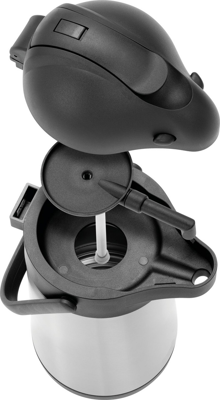 Edelstahl/Kunststoff. Höhe: 33 cm, mit Tragegriff 39 cm, Gläser-/Tassenhöhe: max. 22,5 cm, Ø Stellfläche: 15 cm, doppelwandig, Boden mit integriertem Ring für eine 360°-Drehung der Kanne, Pumpkopf kpl. abnehmbar, nicht spülmaschinengeeignet.