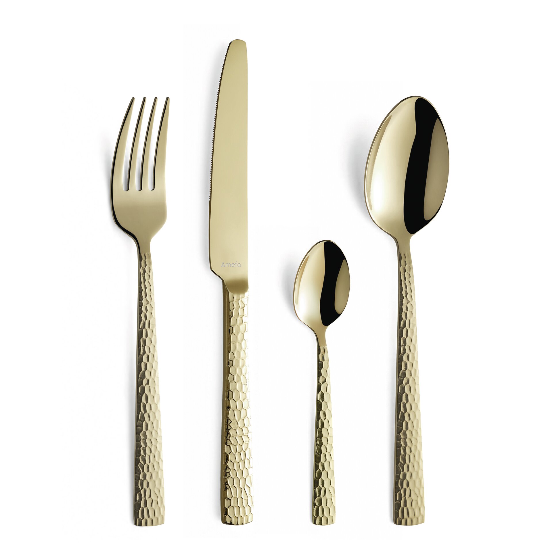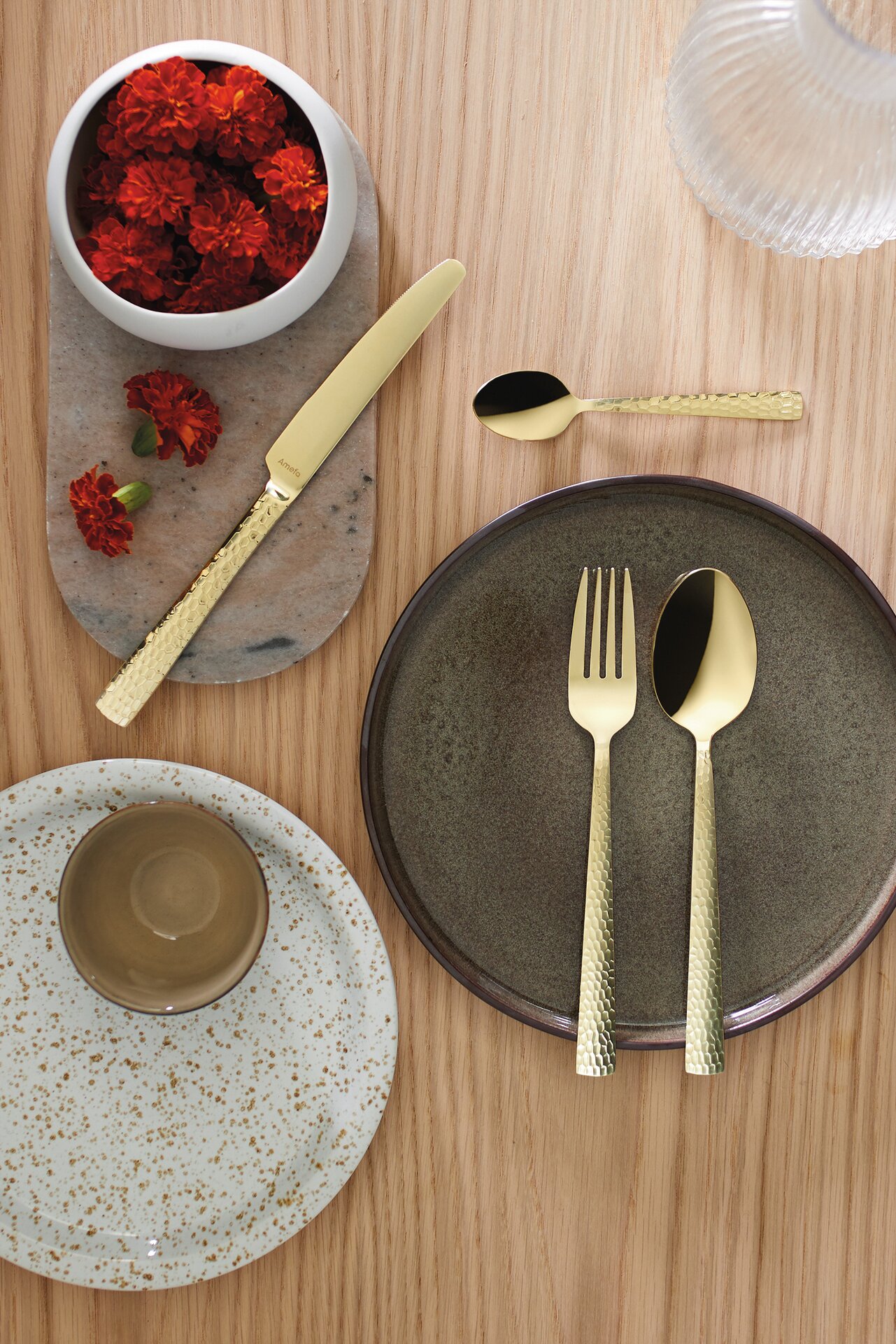 Felicity in Champagner – mit gehämmerter Oberfläche und gerader Form verleiht dieses Besteck deinem Restaurant einen eleganten Look. Passt besonders gut zu leichten, hellen Interieurs oder als Kontrast zu dunklen Möbeln.