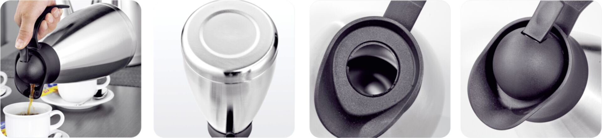 Jetzt auch mit 0,5 Liter Inhalt! Edelstahl, satiniert. Unzerbrechlicher Edelstahleinsatz, doppelwandig isoliert. Einhandbedienung, funktionell, praktisch und schönes Design. Farbe/Deckel: schwarz. Nicht spülmaschinengeeignet. Inhalt/L: 1,0