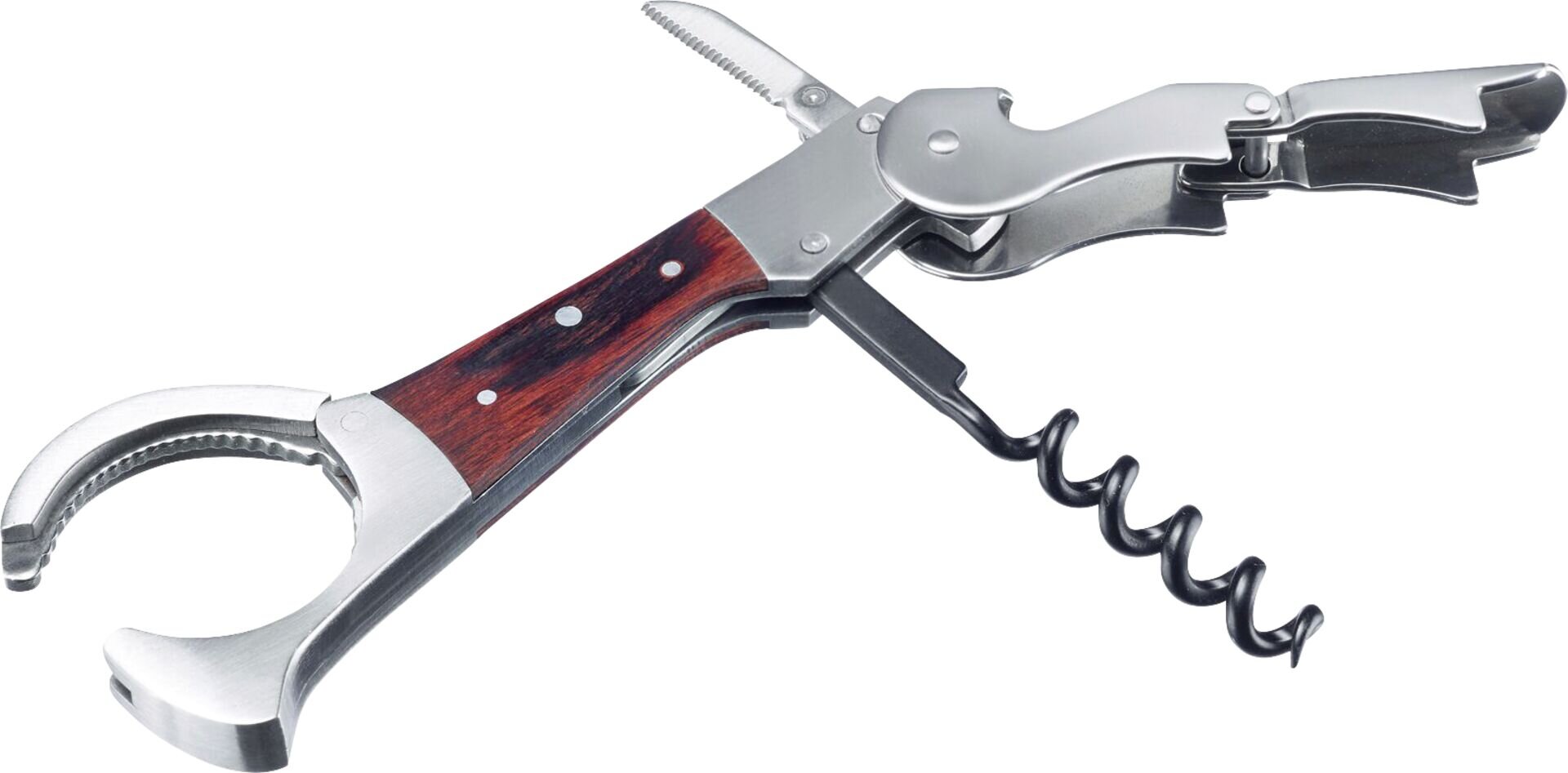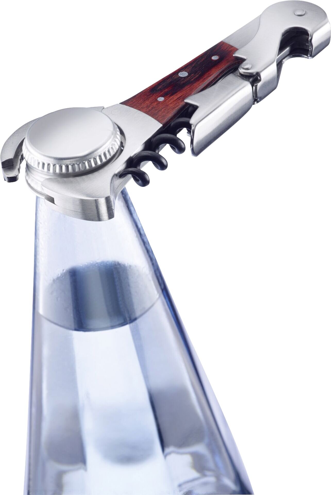 Aus hochwertigem Edelstahl mit Holzinlay, mit gezackter Klinge zum Kapselschneiden, der 2-Stufen Hebel erleichtert das Herausziehen des Korkens, mit Kapselheber für Kronkorken, beschichteter Wendel mit Seele, mit Zangenelement zum Öffnen von festsitzenden Schraubverschlüssen, nicht spülmaschinengeeignet.