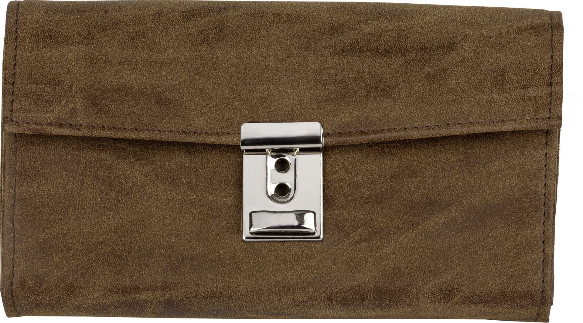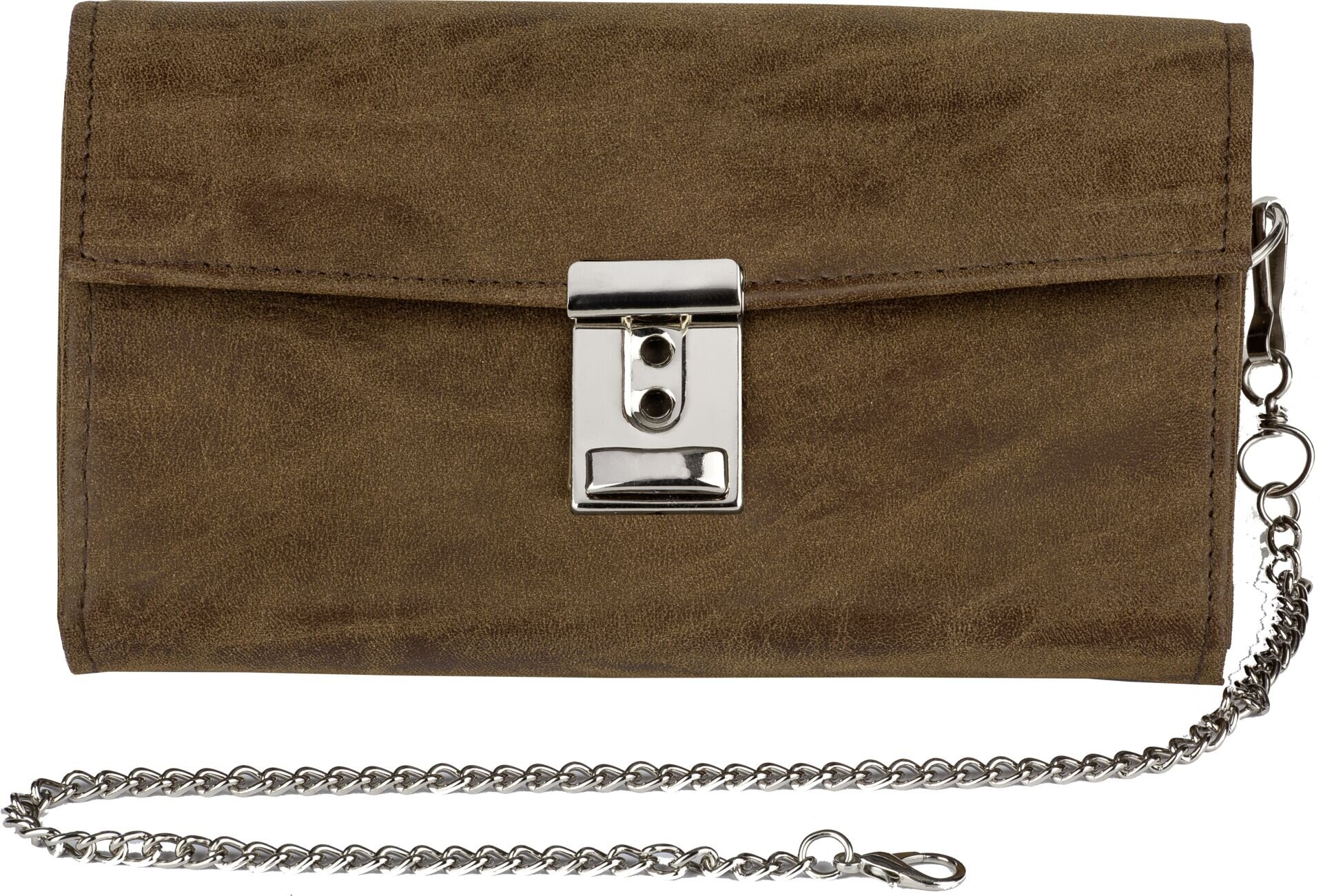 Kunstleder (Nubuk), dunkelbraun. Bestehend aus: 1x Münzfach, 5x Scheinfach, 1x Reißverschlussfach, 1x Steckfach an der Rückseite. Schlüsselkette mit Karabinerhaken.