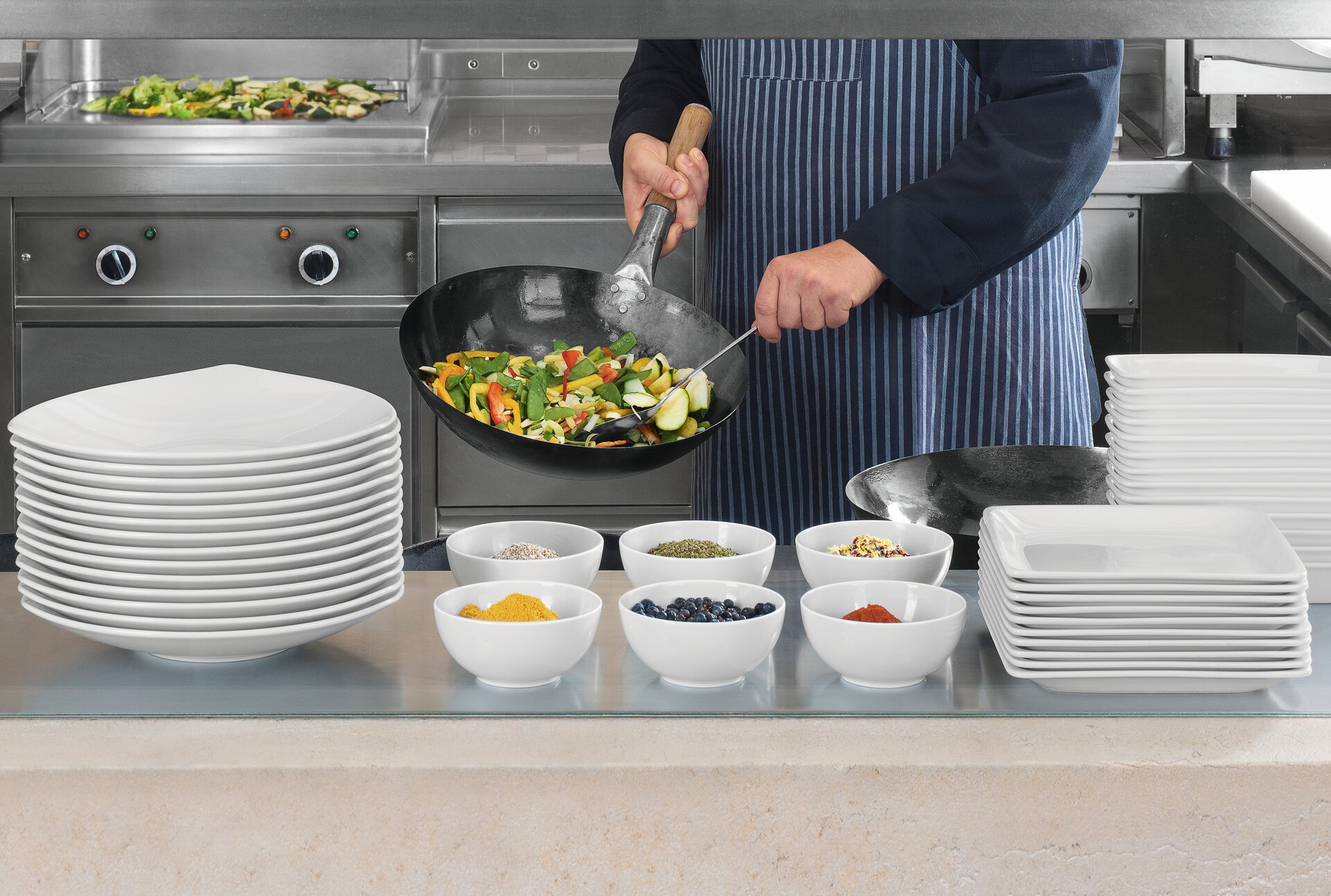Maître ist nicht ohne Grund in der gehobenen Gastronomie eine der beliebtesten Porzellankollektionen. Das großzügige Design zeigt sich in runden Tellern mit breiter Fahne, Platten mit asymmetrisch gestalteter Fahne, variierenden Tassenformen und einem ergänzenden Struktursortiment. Diese Vielfalt verleiht der Kollektion Individualität und Unverwechselbarkeit. Eigenschaften, die nicht nur bei der Zusammenstellung eines Menüs entscheidend sind, sondern die auch vom anspruchsvollen Gast erwartet werden.