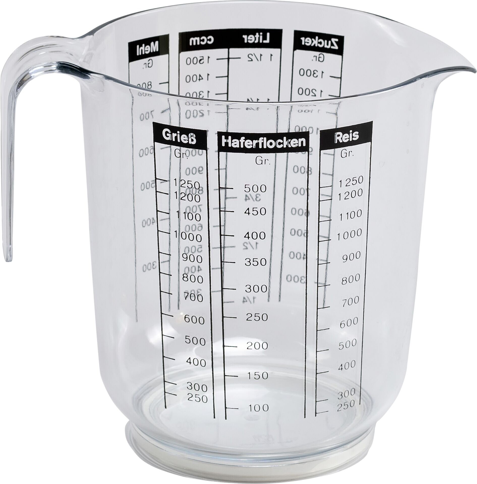ØxH in cm: 13,5x16 Inhalt in L: 1,5 SAN Styrolacrylnitril, transparent. Mit Gummifuß. Messskala, schwarz für Mehl und Zucker, Maßeinheit in Liter und ccm. Skalen für Grieß, Haferflocken und Reis in Gramm auf gegenüberliegender Seite. Spülmaschinengeeignet. Made in Germany!