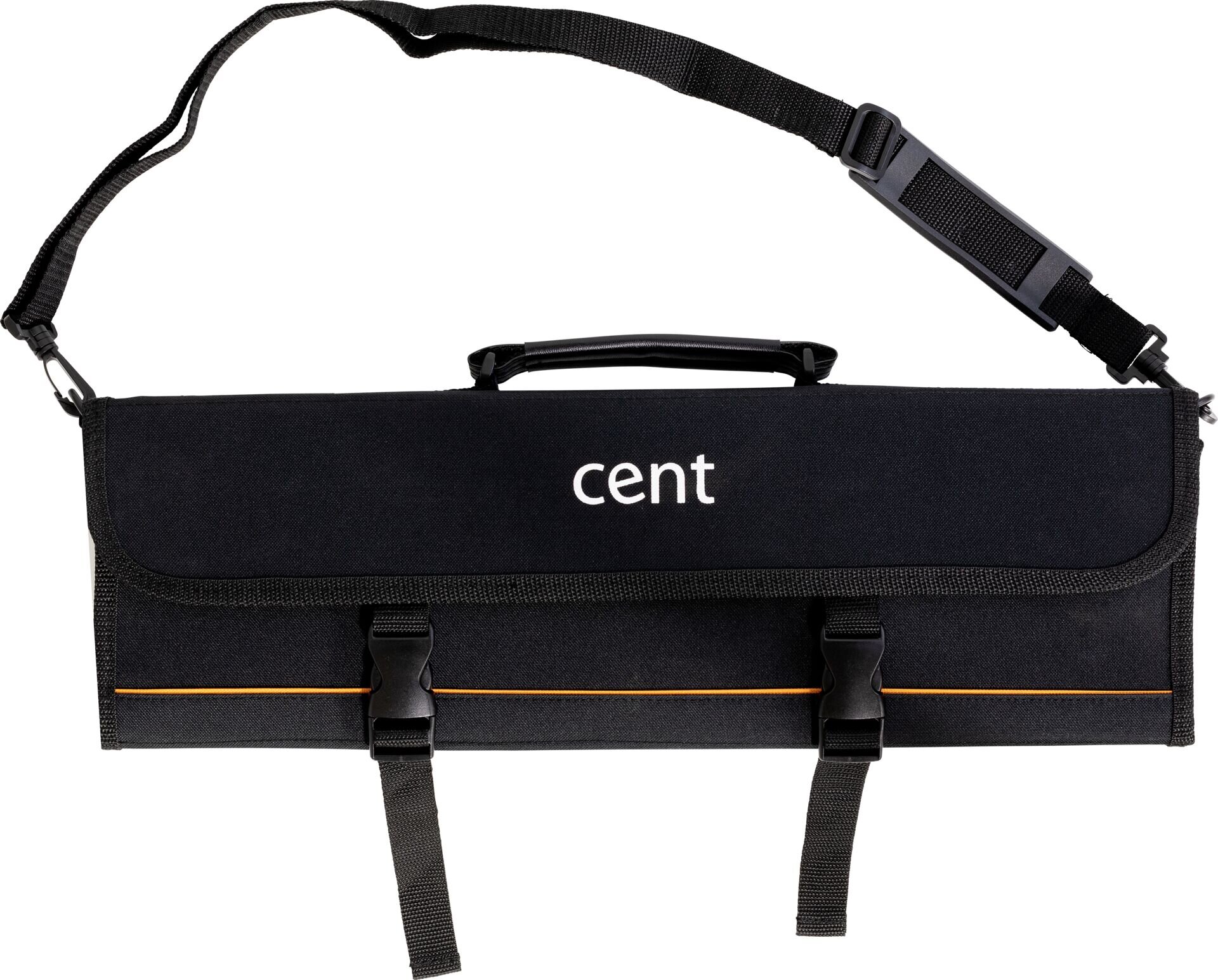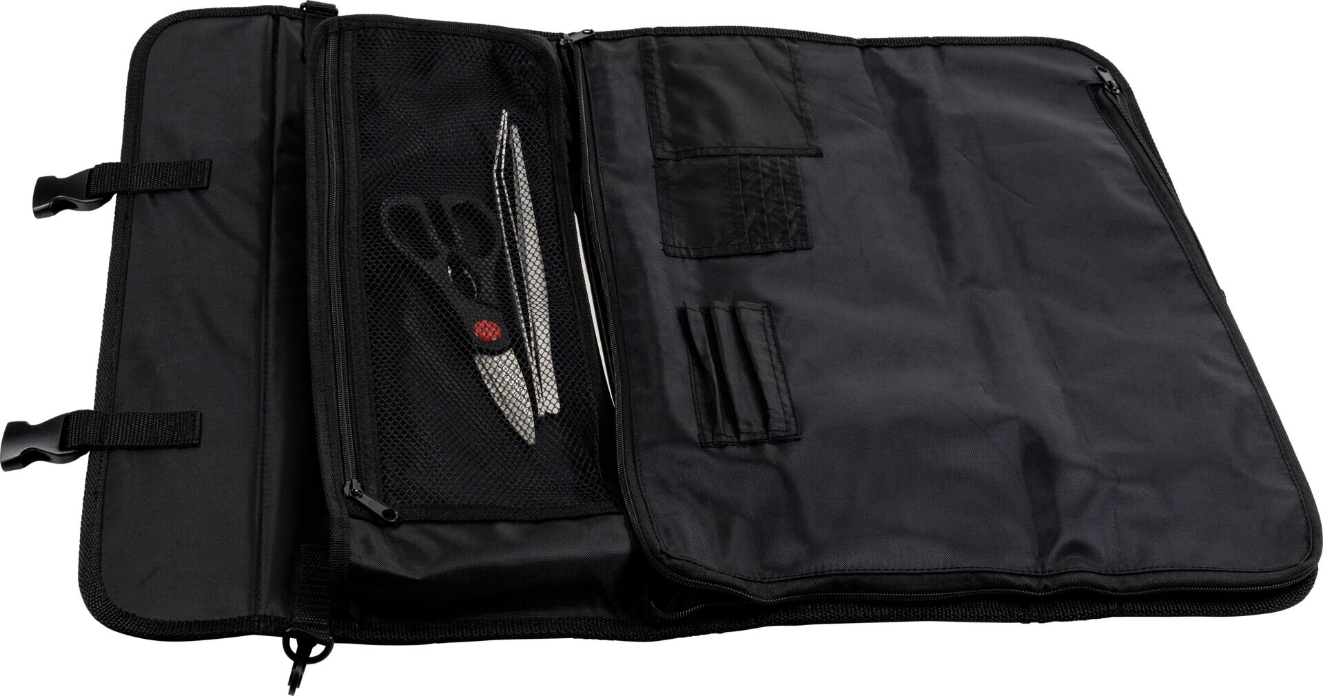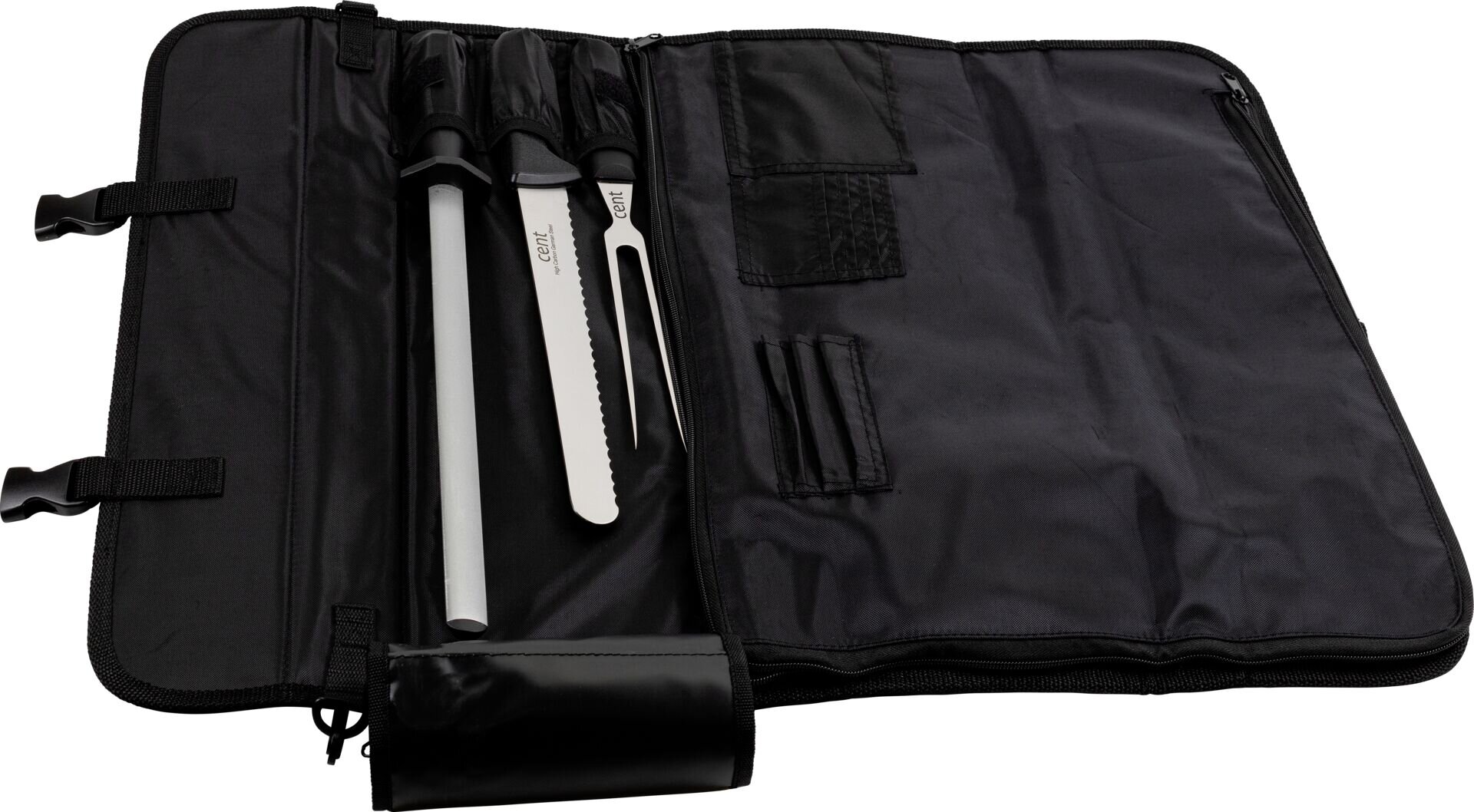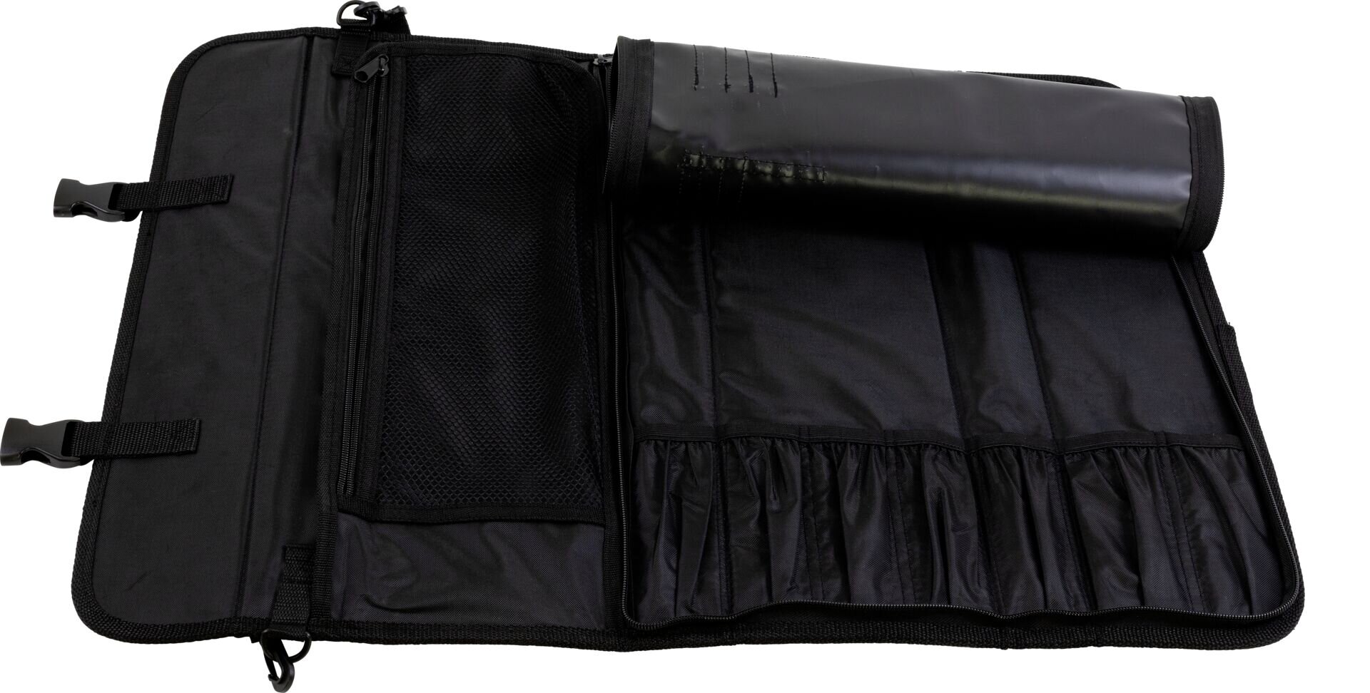 Hauptfach für 7 Messer mit einer max. Gesamtlänge von je 50 cm. Die Messer werden mit einem Gummiband gehalten und sind mit einer Abdeckung geschützt, die 3 Stiftfächer, 4 Visitenkartenfächer, sowie Platz für einen Notizblock (ca. 10x12 cm) beinhaltet und mit einem Reißverschluss fixiert ist. Zusätzliches Netzfach (ca. 13x39 cm) bietet sicheren Platz z. B. für eine Küchenschere oder sonstige Kleinteile. Dieses dient als Abdeckung für weitere 3 Accessoires – z. B. Wetzstahl, Fleischgabel, Handreibe (werden jeweils auch mit einem Gummiband gehalten) und ist mit 2 Klettverschlüssen fixiert. Rückseite mit transparentem Fach für Namenskärtchen/ Adresse und weiterem Reißverschlussfach (ca. 12x49 cm). Längenverstellbarer Klickverschluss, abnehmbarer Schultertragegurt (längenverstellbar) und Tragegriff. Aus strapazierfähigem Textilgewebe, reiß- und abriebfest. Abmessungen geschlossen: ca. 52x18x7 cm. Farbe: schwarz mit orangem Streifen. Ohne Inhalt.