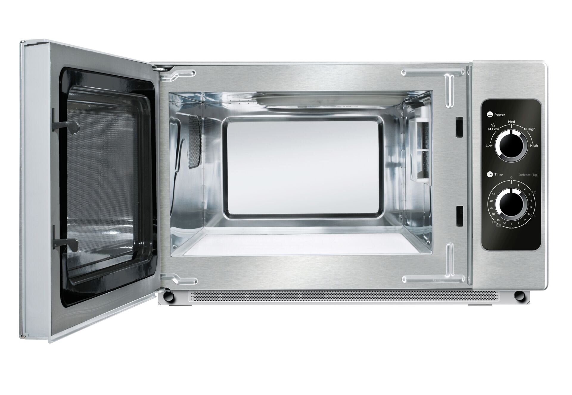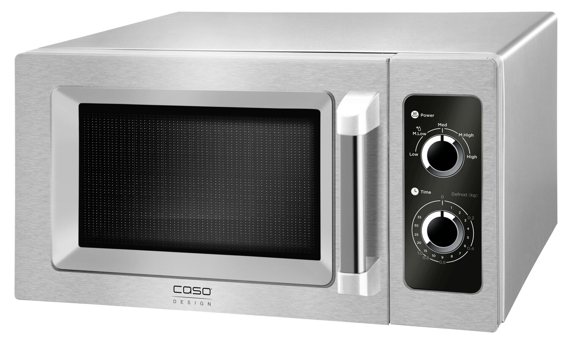 Gewerbemikrowelle, Gehäuse und Innenraum Edelstahl, Garraumvolumen ca. 25 L, 5 Leistungsstufen, Auftaufunktion mit Signalton, Innenraumbeleuchtung, Innenmaß: 33,0x20,0x32,0cm, 1 Magnetron, Keramikboden mit Mikrowellenreflektor, kein Drehteller notwendig, deutlich größere Nutzfläche, einstellbare Garzeit bis max.30 Min., 2 Drehknöpfe zur Bedienung.