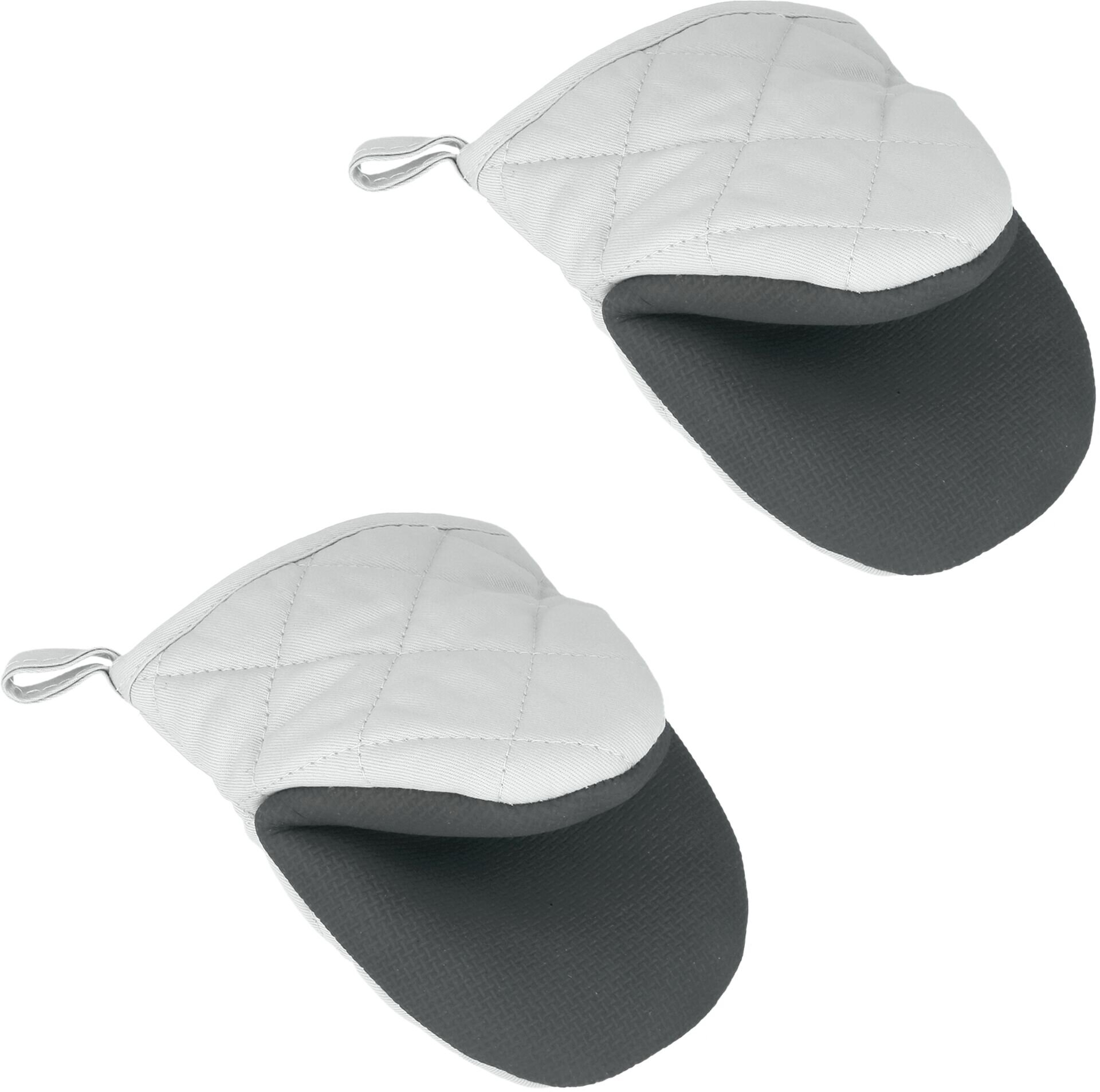 Baumwolle, Gummi, Polyester. Rutschfeste Handfläche aus Gummi. Auf Kontaktwärme geprüft: max. 250 °C für mindestens 15 Sekunden. CE zertifiziert. Im 2er Pack.