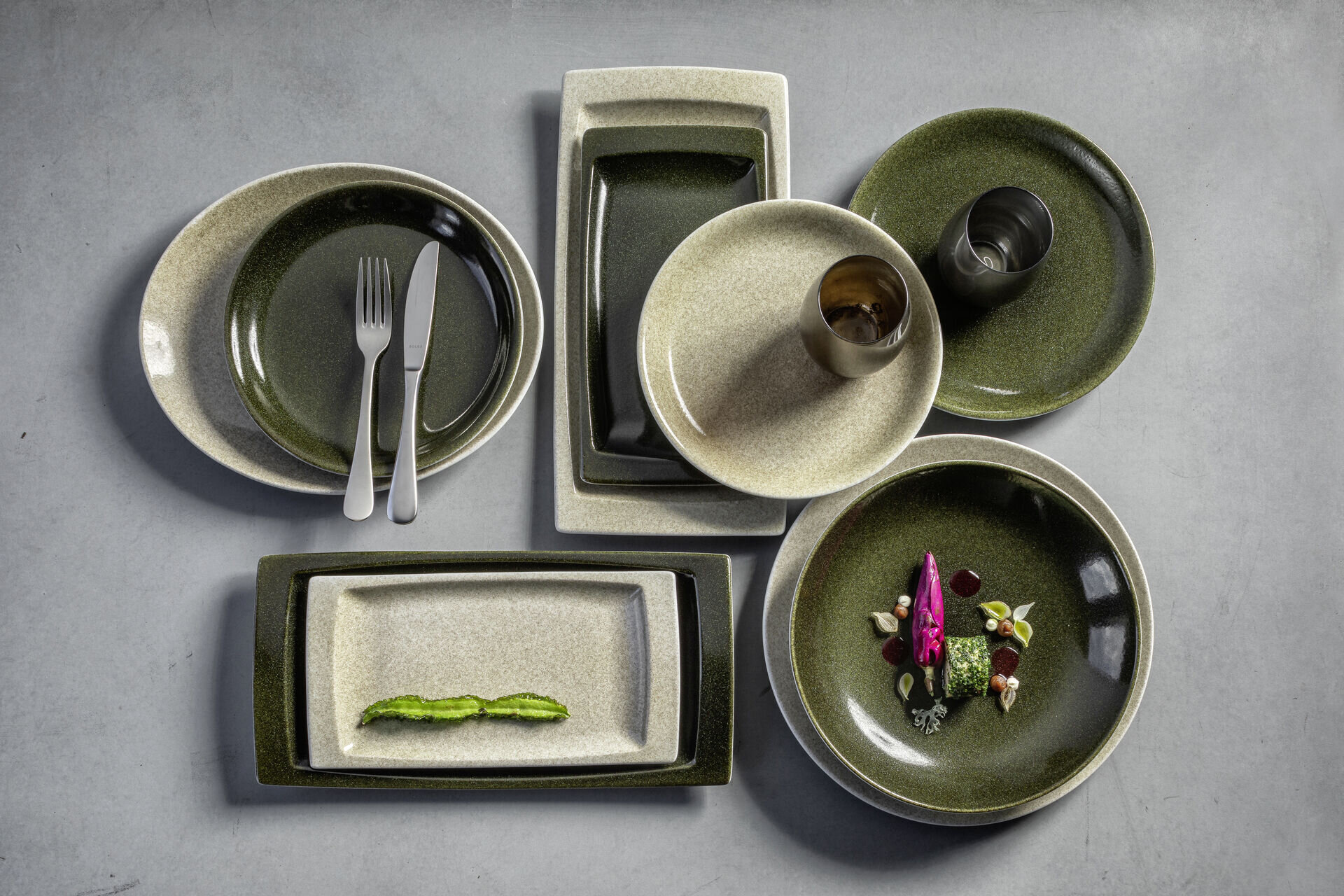 Porzellan. Farbe Jungle. Feine Glimmer Partikel (natürliches Mineral), welche in der Glasur verarbeitet wurden und je nach Lichteinfall dezent glitzern, machen diese Serie so außergewöhnlich. Der besondere Farbeffekt wird noch verstärkt durch die unterschiedlich intensiven Grün-Töne. Mischsortierung. Spülmaschinengeeignet.