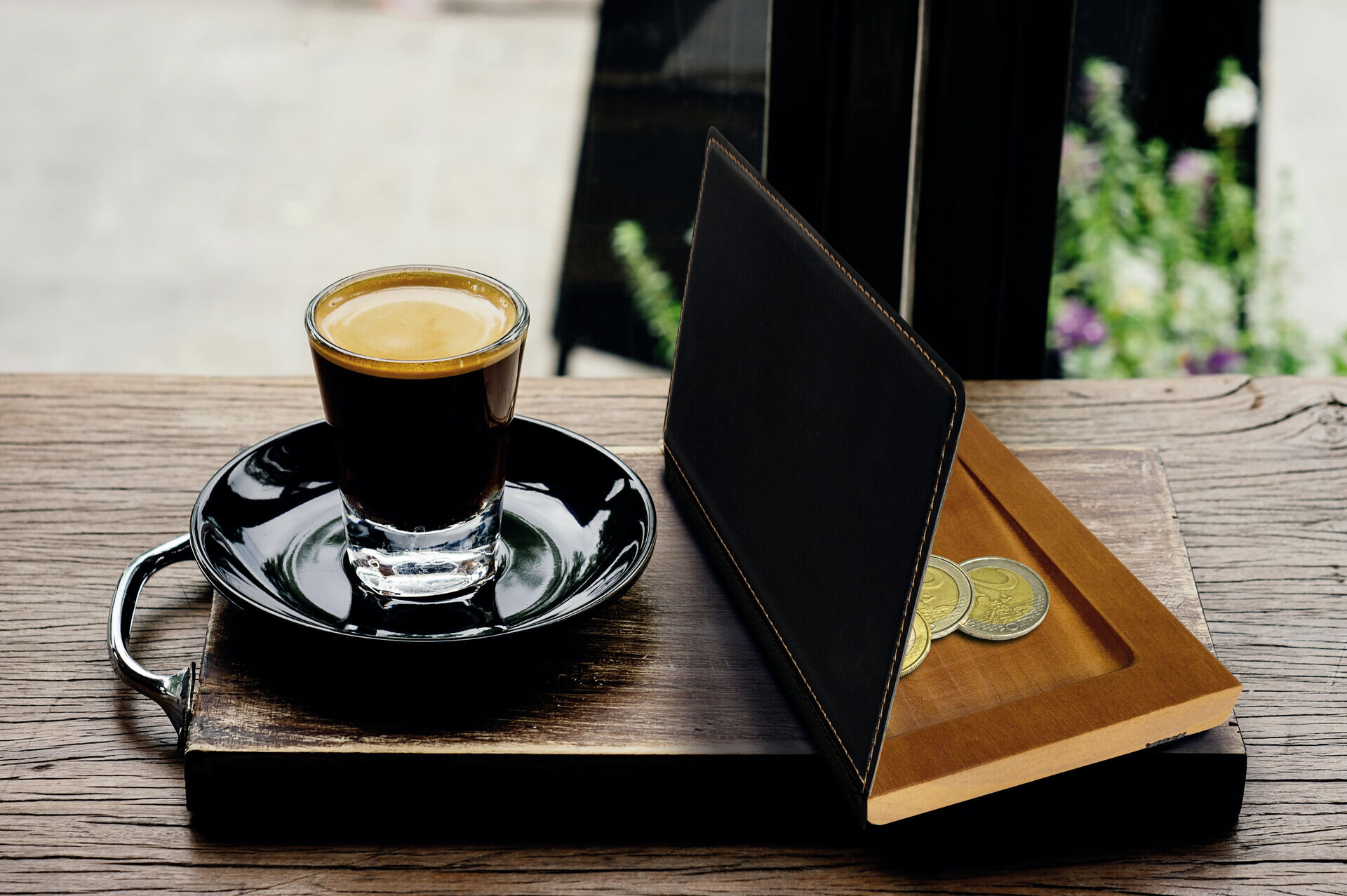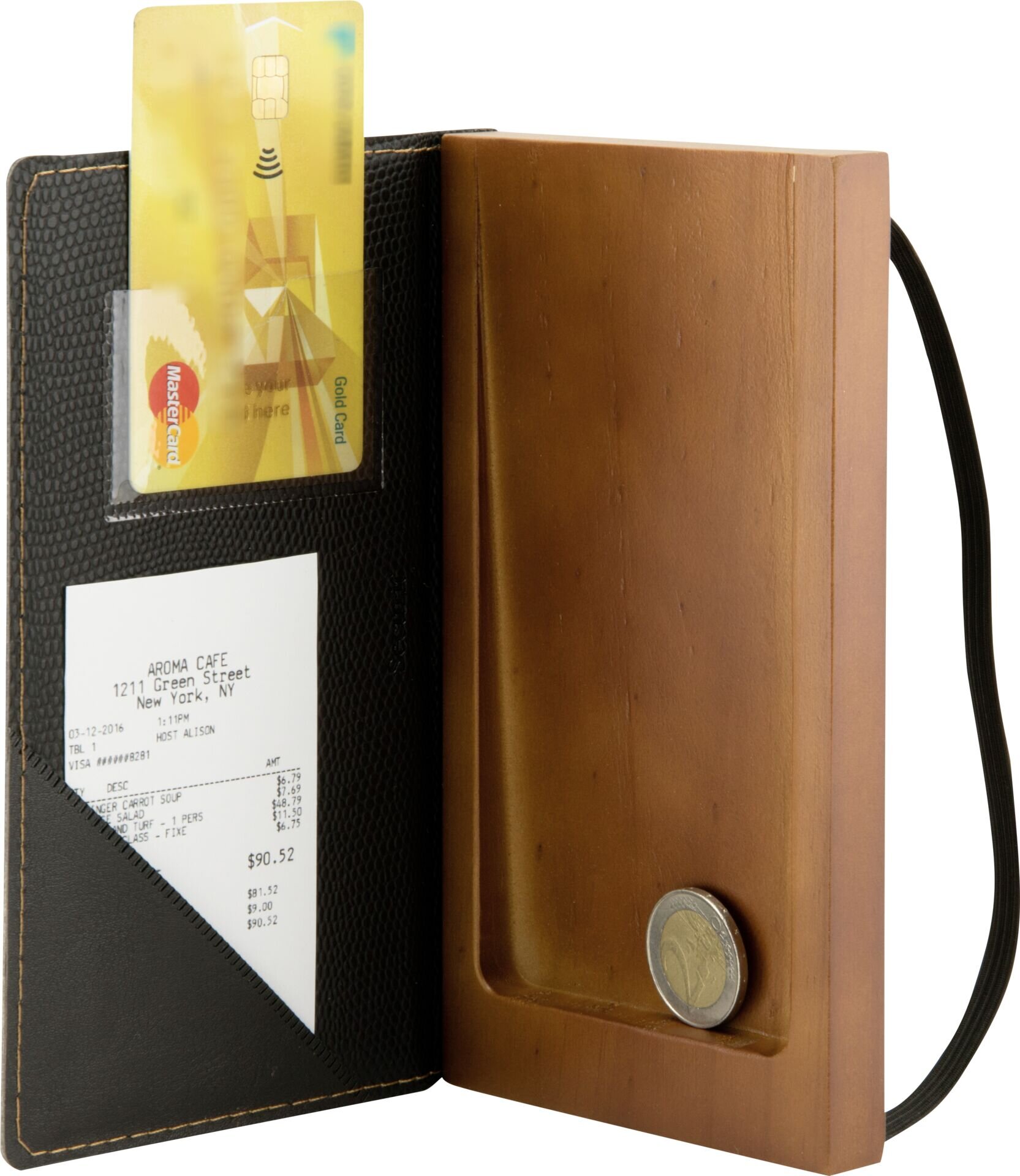 Polyurethan Rechnungsmappe (Lederoptik) mit handgestickten Seitenrändern und hölzernem Münzhalter. Einsteckfach für Karten. Mittels elastischem Band leicht zu schließen.