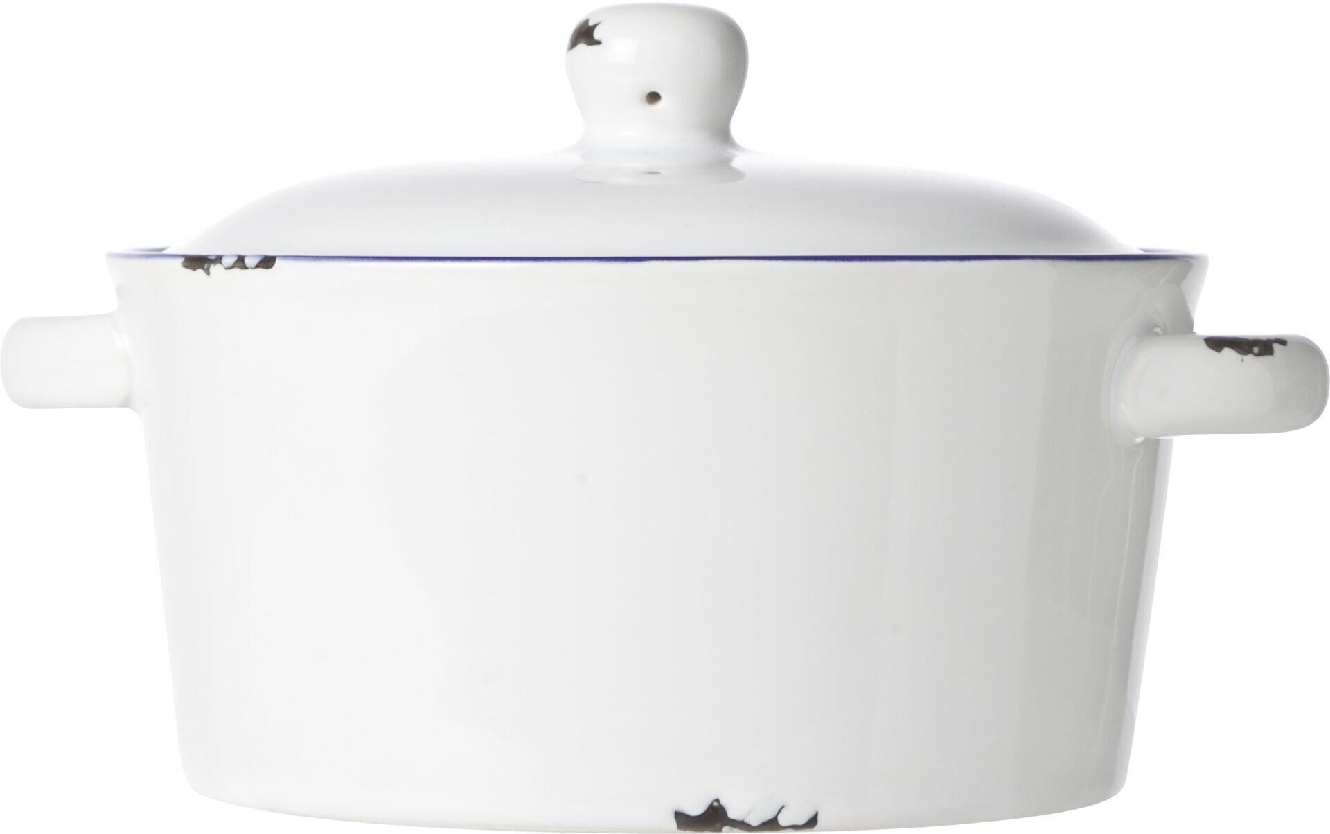 Steinzeug im Vintage-Look, weiß mit blauem Rand und optisch abgeschlagenen Ecken und Kanten in schwarz. Spülmaschinengeeignet.