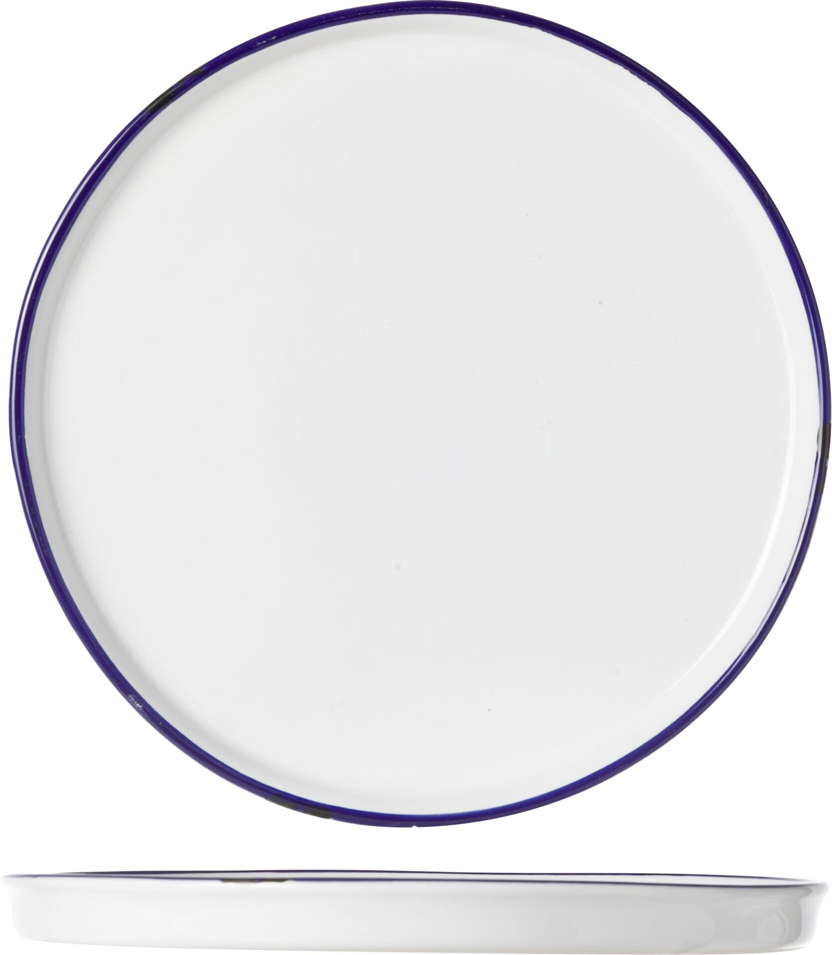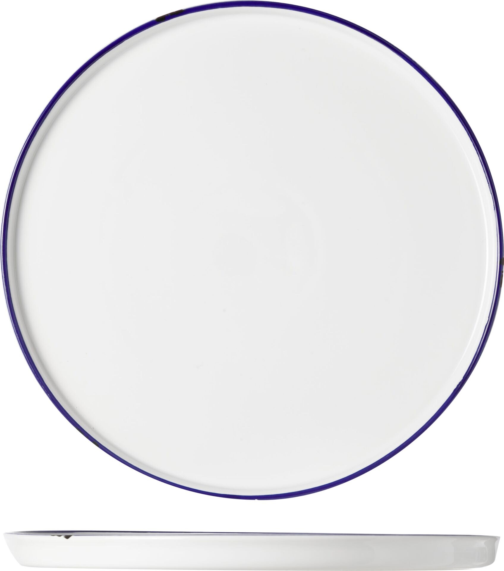 Steinzeug im Vintage-Look, weiß mit blauem Rand und optisch abgeschlagenen Ecken und Kanten in schwarz. Spülmaschinengeeignet.