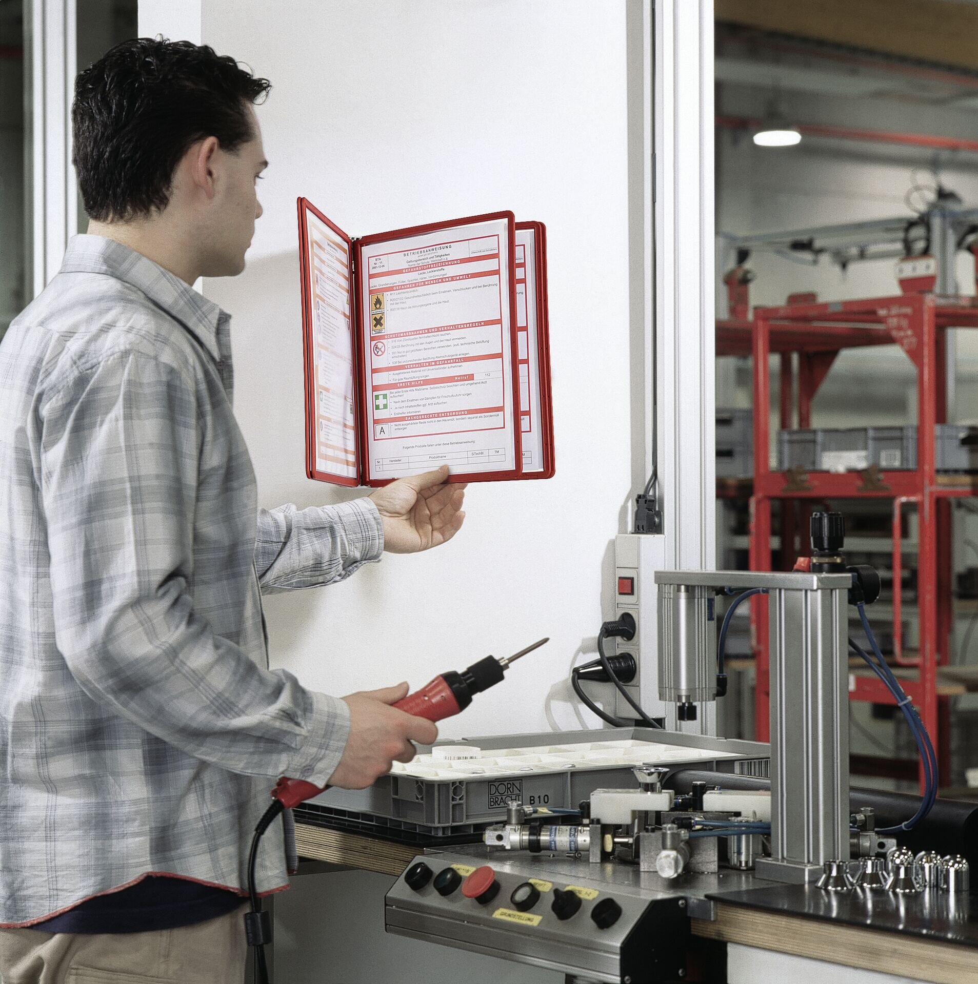 Wandhalter aus Metall mit 5 Sherpa Sichttafeln im Format DIN A4, rot, inkl. Schrauben und Dübel.